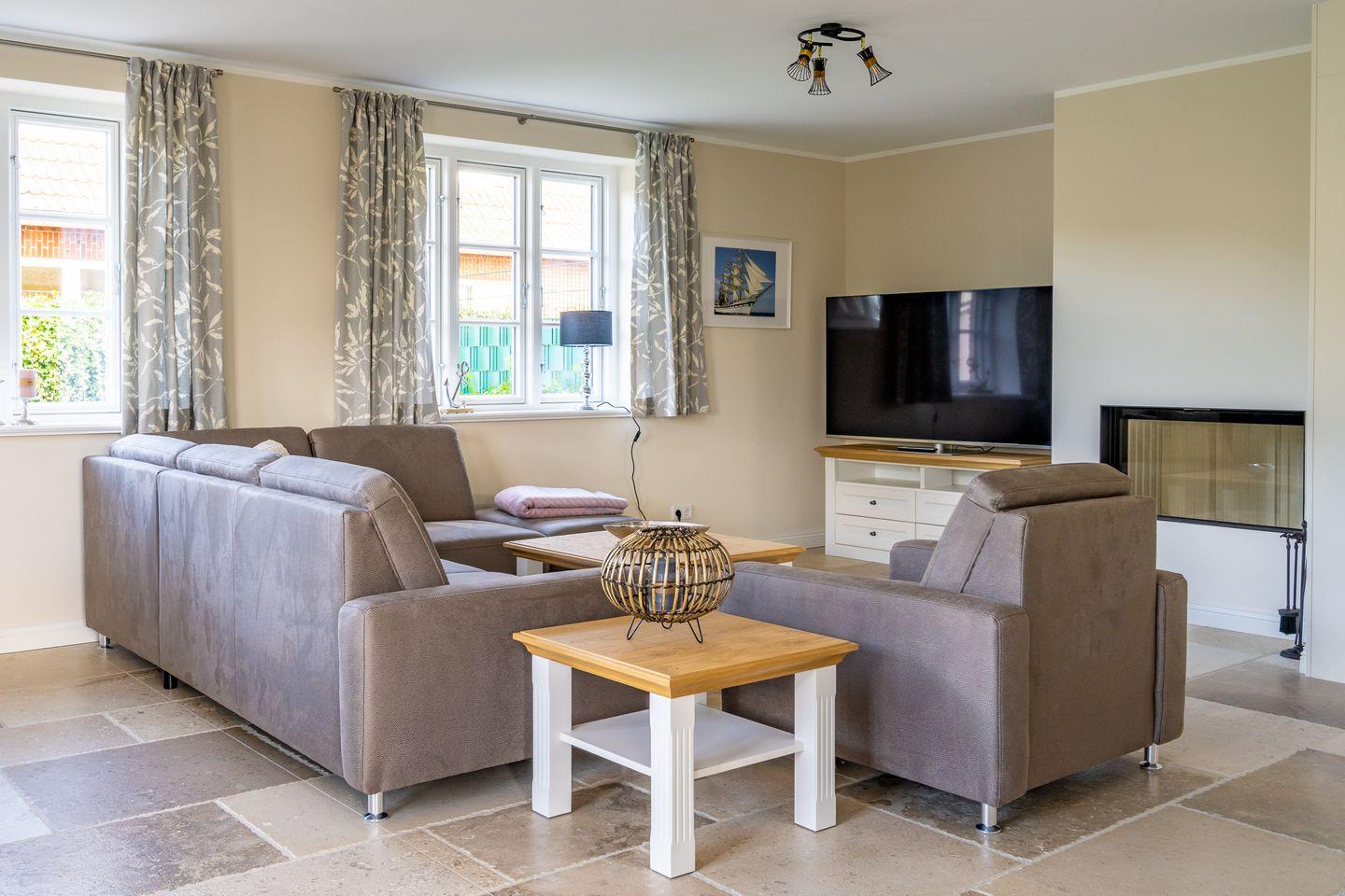 Zu den Highlights der Ferienunterkunft zählen wir u. a. den hochwertigen Kamin sowie den blickgeschützten und umzäunten Garten mit Terrasse.