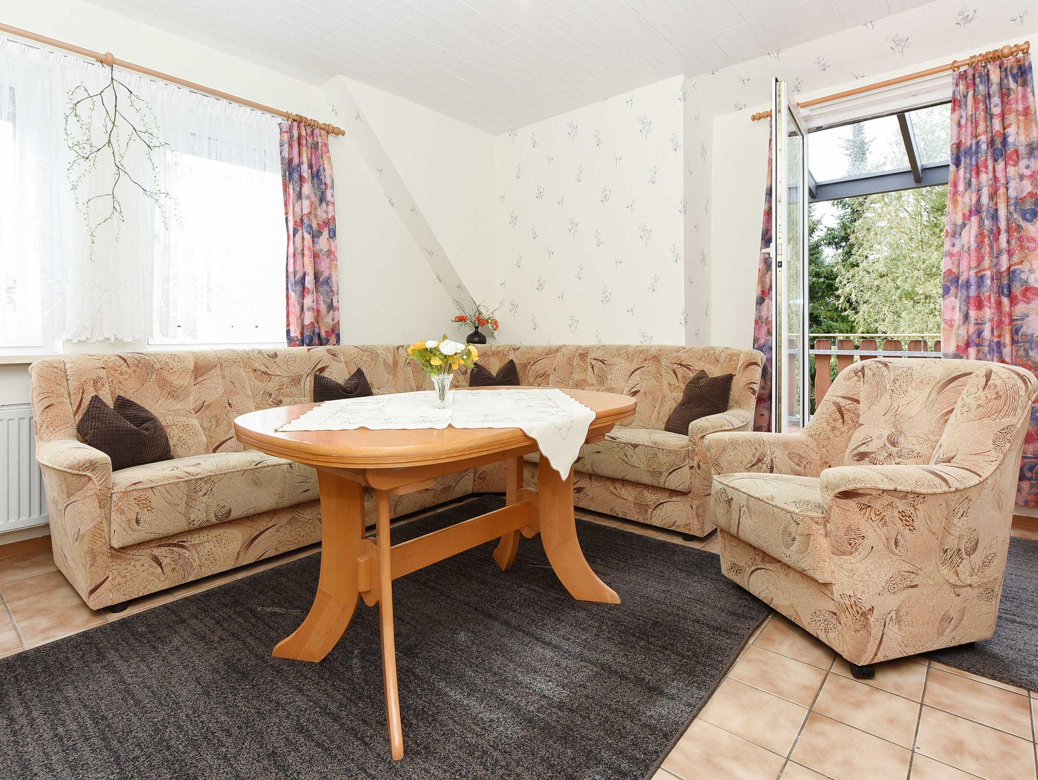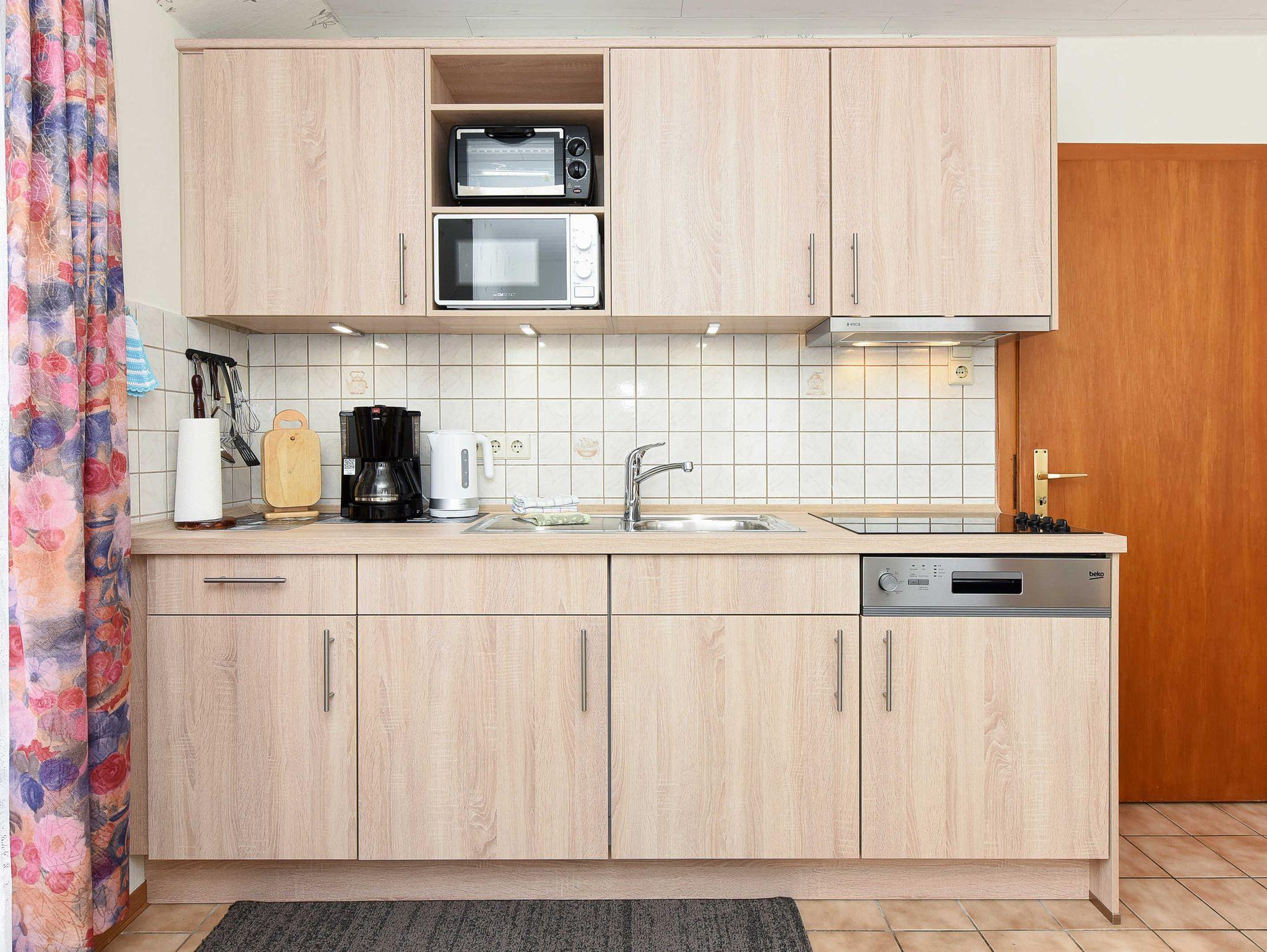 Größe ca. 45 Quadratmeter, Wohnraum mit integrierter Küche, Schlafzimmer, zweites separates Schlafzimmer/Kinderzimmer, Dachstudio, Badezimmer mit Dusche, Waschtisch und WC, Obergeschoss, Balkon, optimal für 2 bis 3 Personen.