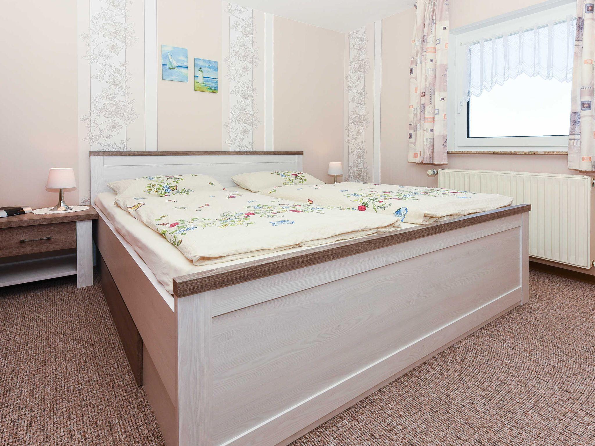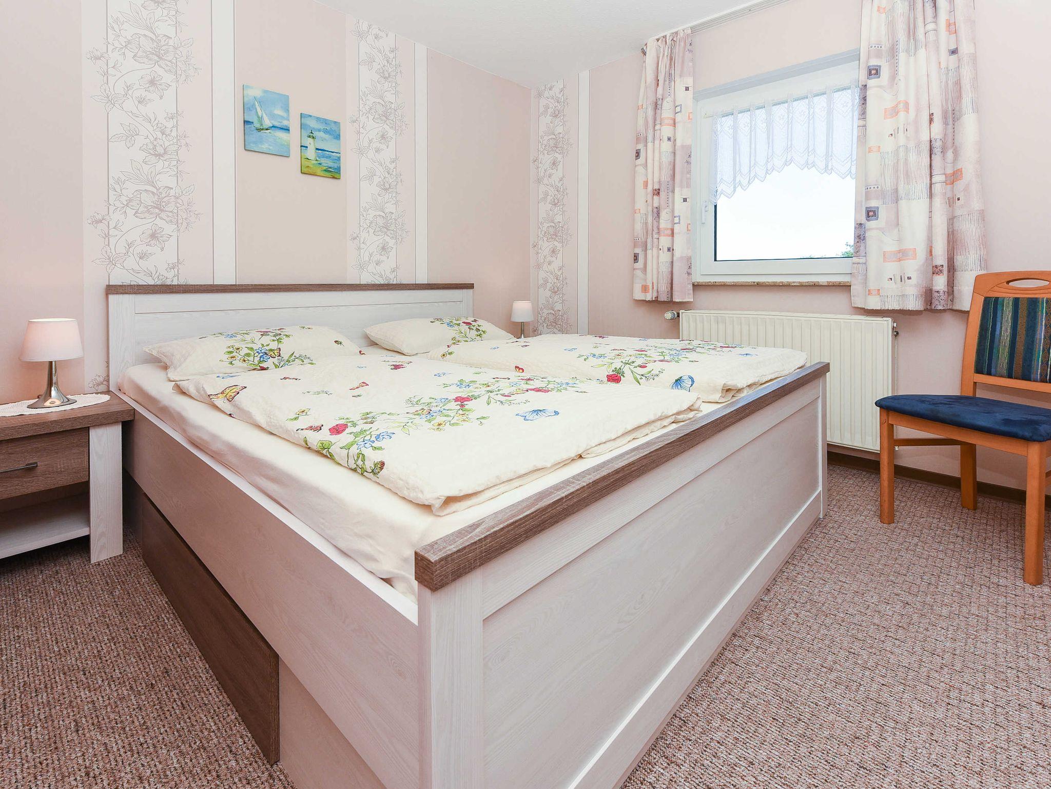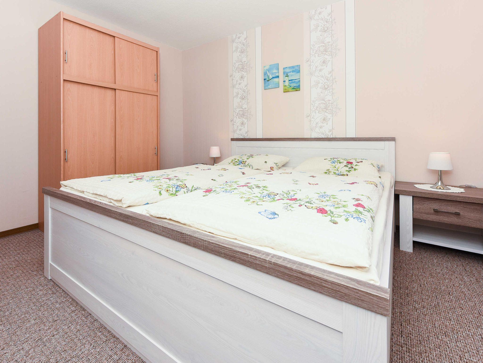 Größe ca. 55,5 Quadratmeter, Wohnraum mit integrierter Küche, Schlafzimmer, zweites separates Schlafzimmer/Kinderzimmer, Badezimmer mit Badewanne, Dusche, Waschtisch und WC, Obergeschoss, Terrasse (Sitzgruppe im Garten), Balkon, optimal für 2 bis 4 Personen und zusätzlich ein Kleinkind.