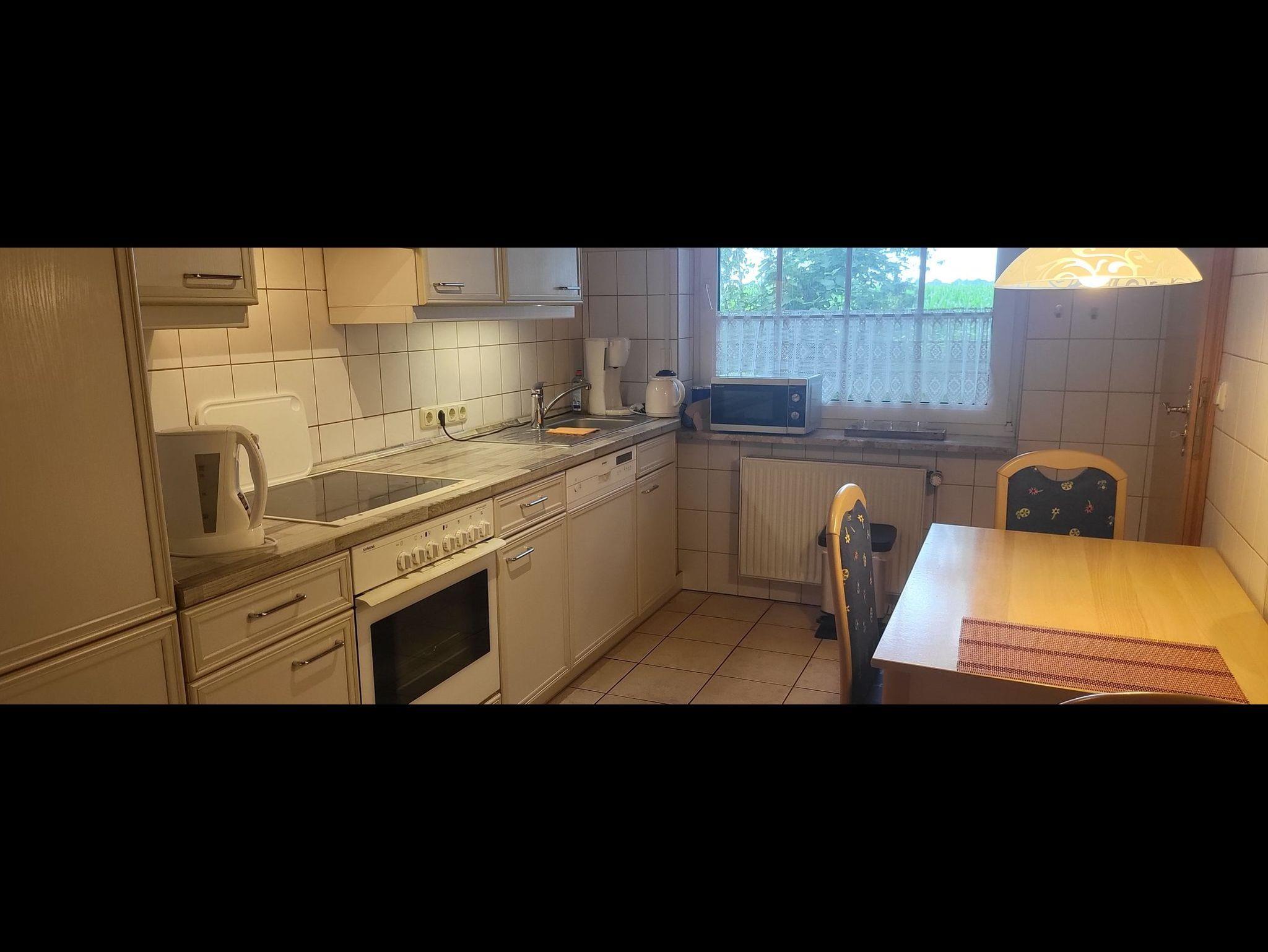 • Küche mit Ceran-Kochfeld, Backofen, Mikrowellengerät, Kühlschrank mit Gefrierfach, Kleingeräte wie Kaffeemaschine, Toaster, Wasserkocher. Ausreichend Geschirr und Küchenutensilien.