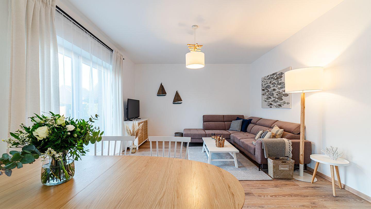 Der große, helle Wohn- und Essbereich liegt in Nord-/Westrichtung mit wunderschönem Blick über das Grundstück. Die große Wohnlandschaft lädt zum Verweilen ein und kann bei Bedarf mit einem Handgriff weiter ausgezogen und in eine Schlafcouch umfunktioniert werden. Die großzügig ausgestattete helle Einbauküche mit Kühl-/Gefrierkombination, Backofen, Induktionsherd, Geschirrspüler, Kaffeemaschine, Toaster, Wasserkocher und vielen weiteren Extras macht das Kochen im Urlaub zu einem Erlebnis.