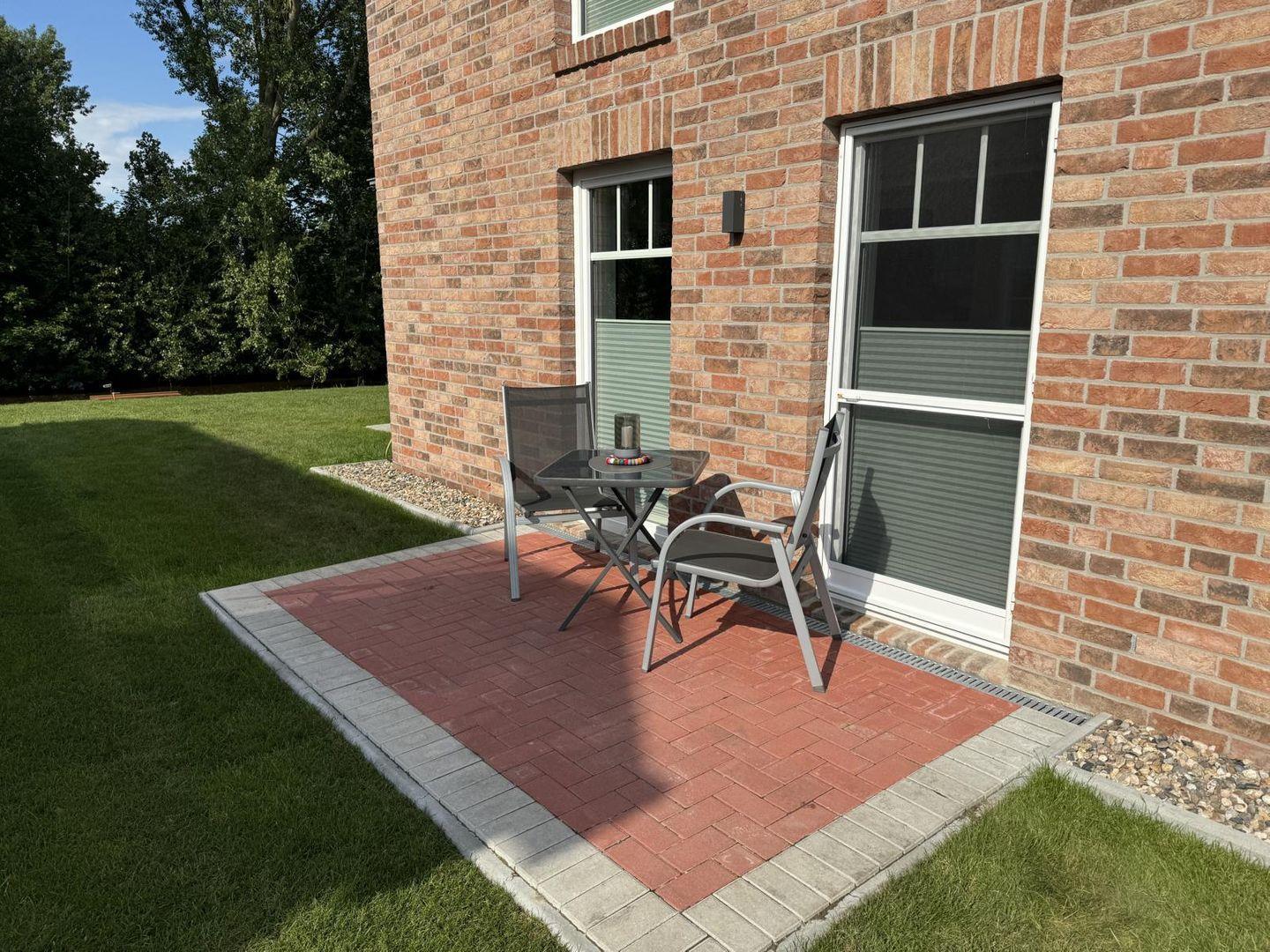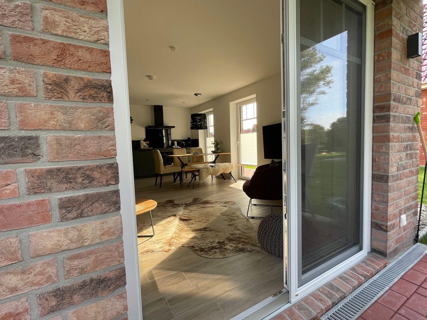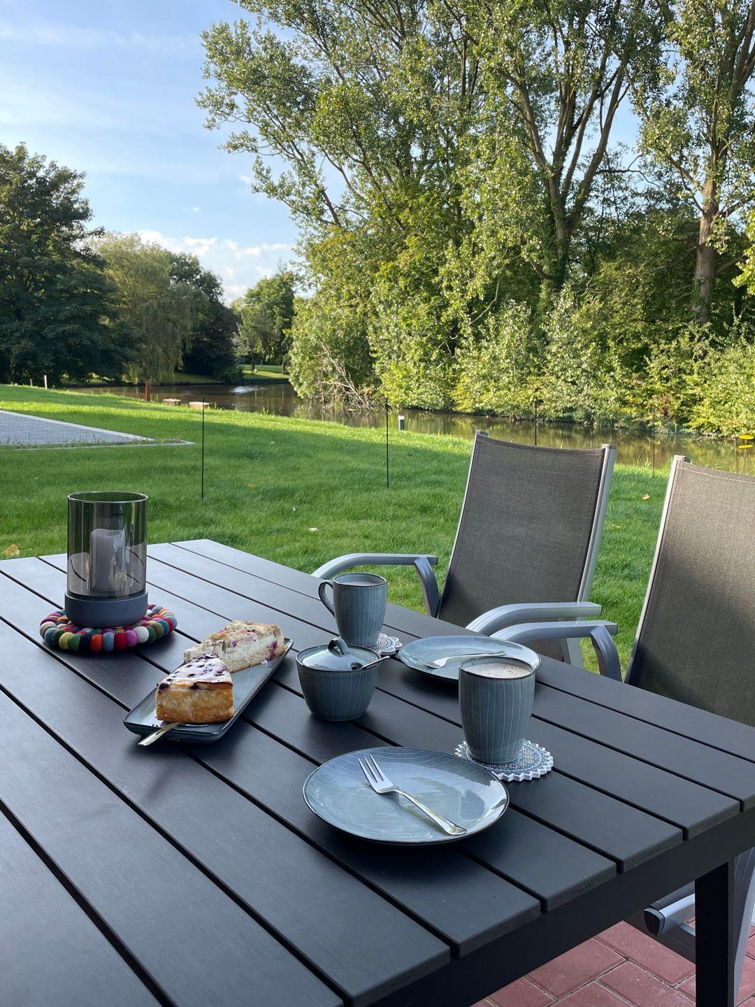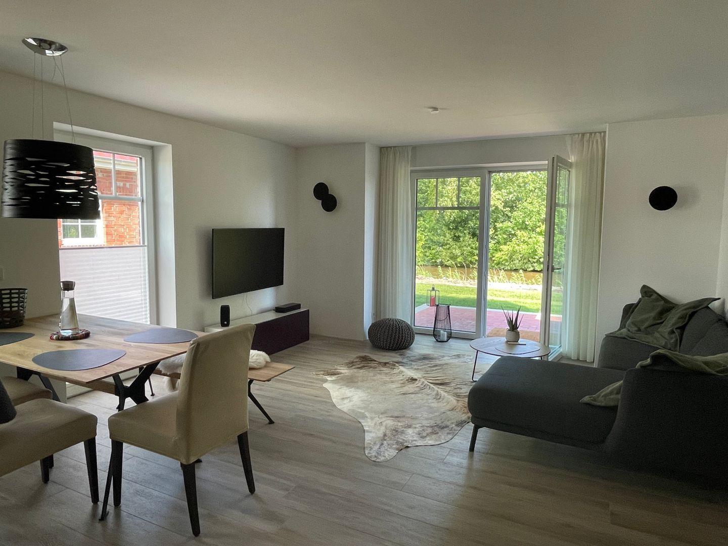 Moderne Neubauwohnung in Eilsum mit privatem Steg am Wasser und zwei Terrassen für entspannte Urlaubstage.