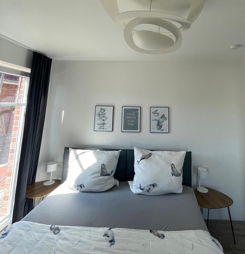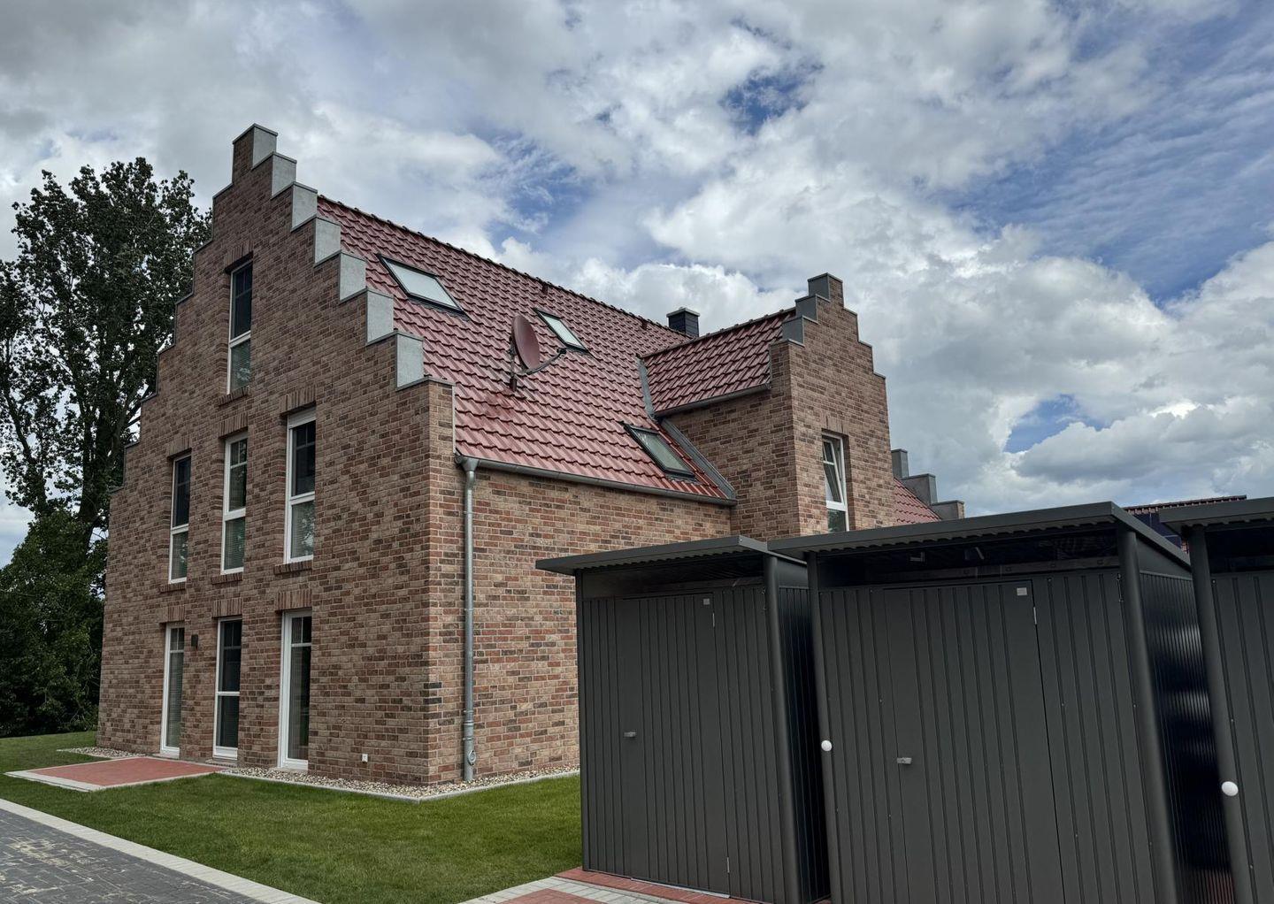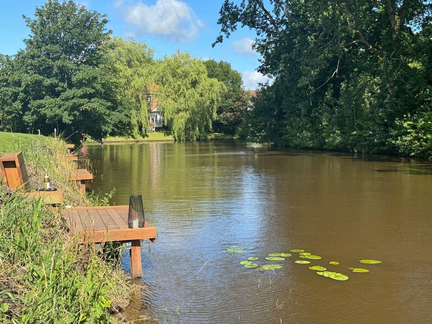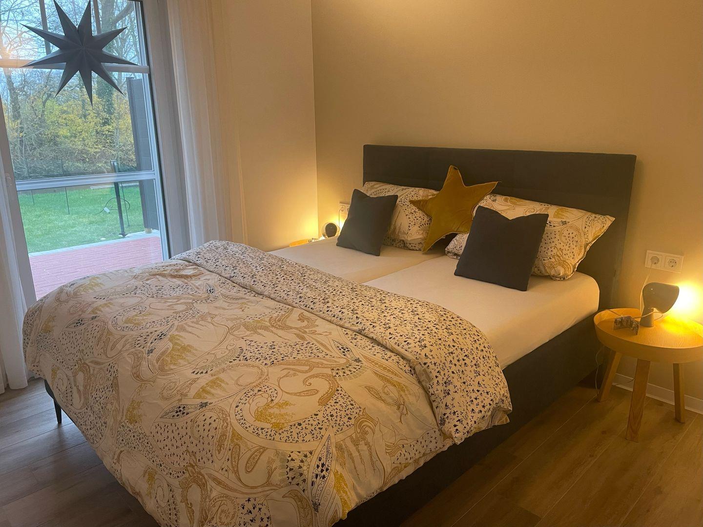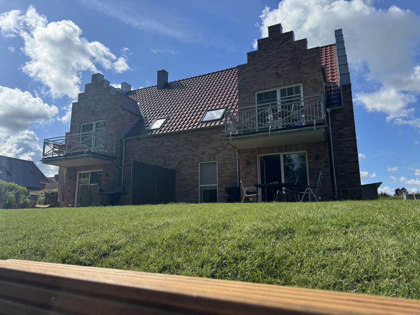 Moderne Neubauwohnung in Eilsum mit privatem Steg am Wasser und zwei Terrassen für entspannte Urlaubstage.