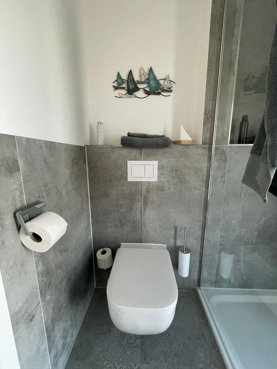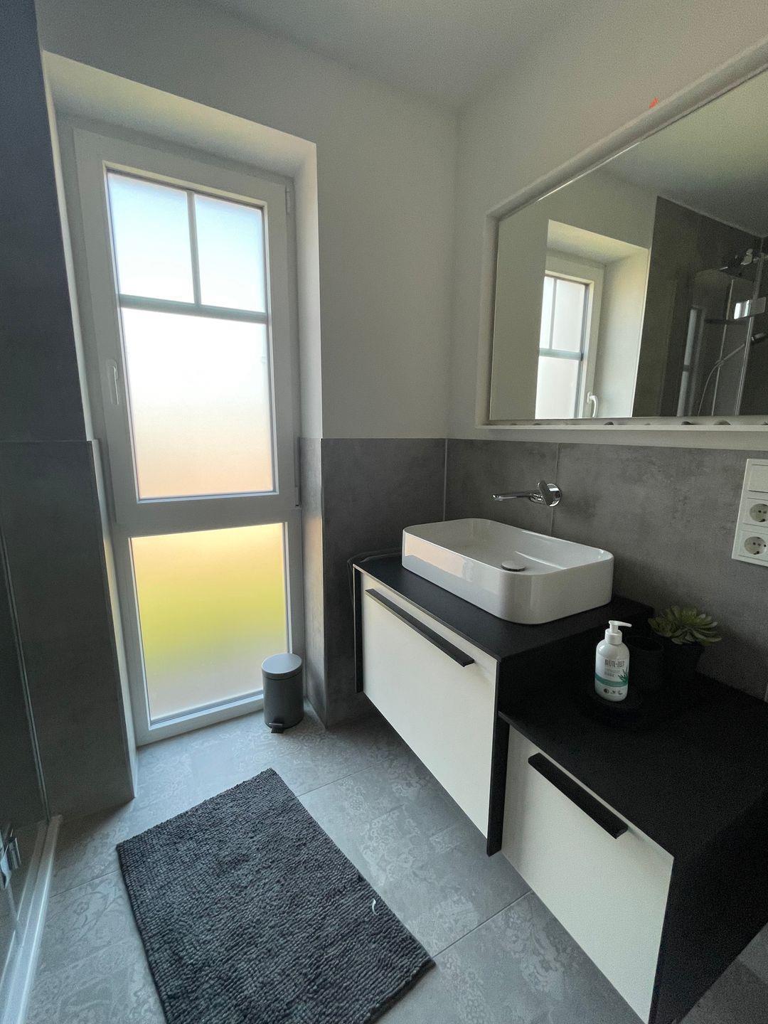 Das Bad ist klein, aber fein. Es verfügt über eine großzügige bodengleiche Dusche mit Glasabtrennung und einem schönen Design Waschtischmöbel sowie einem WC. Ebenfalls dort vorhanden ist ein Waschtrockner und ein Fön.