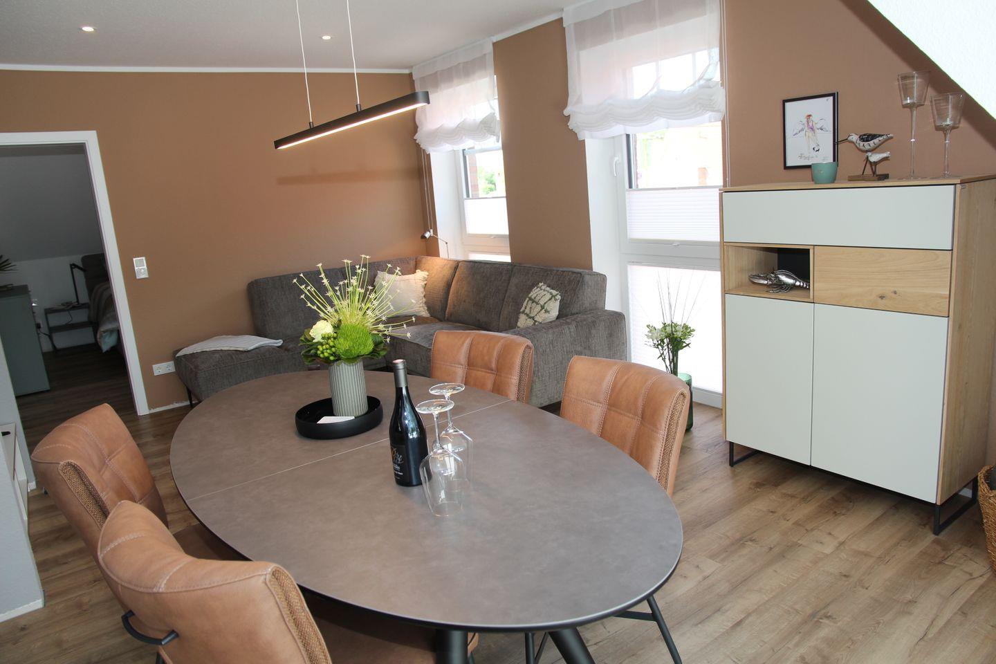 Sie betreten einen lichtdurchfluteten Wohn- Essbereich mit angrenzender offener Küche. Von den sehr bequemen Stühlen am Esstisch blicken Sie über den möblierten Balkon direkt auf das nur wenige Meter entfernte Siel und in die Natur von Eilsum. Das gemütliche Sofa lädt zum Entspannen oder Fernsehen (Smart TV) ein. In der großzügig geplanten Küche bleiben keine Wünsche offen (Spülmaschine, Mikrowelle, Induktions-Kochfeld, Backofen, Kühlschrank mit separatem Gefrierschrank, Filter-Kaffeemaschine, Nespresso-Automat, Toaster, Wasserkocher, Hand- und Stabmixer etc.). Ausreichender Stauraum und großzügige Arbeitsflächen laden zu kulinarischen Aktivitäten ein.