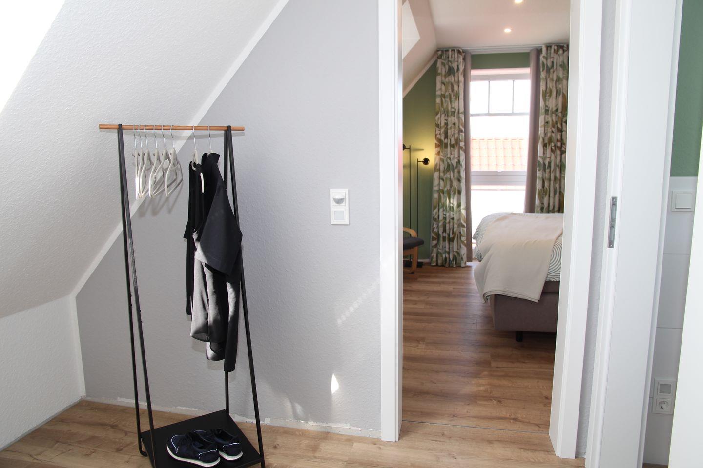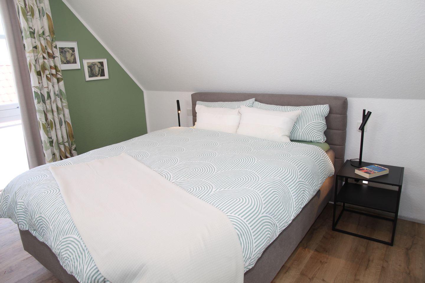 Im ausgebauten Dachgeschoss befindet sich das zweite Schlafzimmer mit einem weiteren Boxspringbett 160 x 200cm (einzelne Matratzen mit durchgehendem Topp) sowie einem Lesesessel. Auch gibt es hier ein separates WC mit Waschbecken.