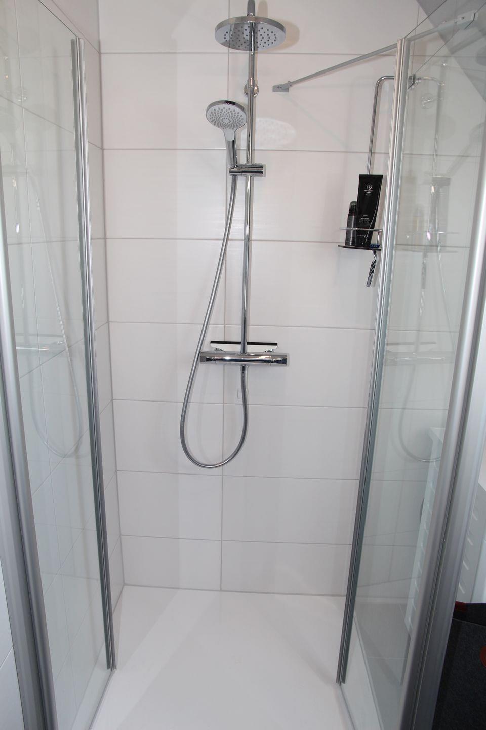 Das helle Badezimmer im OG bietet eine ebenerdige Dusche inkl. Rainshower, einen Waschtisch mit ausreichend Stauraum und Fön sowie einen kombinierten Waschtrockner.