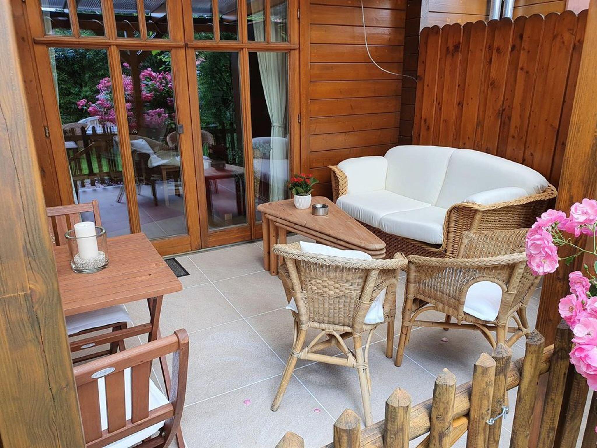 Die Ferienwohnung ist gemütlich und mit umfangreichem Inventar ausgestattet. Sie verfügt über ein Schlafzimmer mit Doppelbett (1,80m x 2,00m) und ein Wohnzimmer mit komfortabler Sofagarnitur und Ottomane mit Schlaffunktion (mit Topper, für bis zu 2 Personen). Über ein Gäste-WLAN und den Glasfaseranschluß besteht ein schneller Internetzugang. Zusammen mit separater Küche (mit Einbauküche) und Esstischgarnitur, Flur, und Badezimmer (Fußbodenerwärmung und Handtuchheizkörper) mit Dusche/WC hat die Ferienwohnung eine Wohnfläche von ca. 49qm. Dazu gehört eine Terrasse (mit Gartenmöbeln) in der Größe von 3mtr x 3,60mtr. Auf der Terrasse steht ein Ceran-Grill und ein Infrarot-Heizstrahler zur Verfügung. Flur und Wohnzimmer haben Laminatboden. Die Küche hat Korkboden. Im Schlafzimmer liegt Klick-Vinylboden. Aufgrund der verwendeten Bau- und Einrichtungsmaterialien ist die Ferienwohnung Allergiker geeignet. Aus diesem Grund können leider keine Haustiere mitgenommen werden. Auf Wunsch können ein Kinderbett und ein Hochstuhl zur Verfügung gestellt werden, aber aufgrund eines vorhandenen Gartenteiches ist die Ferienwohnung für Kleinkinder eher nicht geeignet. Die Wohnung ist eine Nichtraucherwohnung. Auf der Terrasse kann aber gerne geraucht werden.