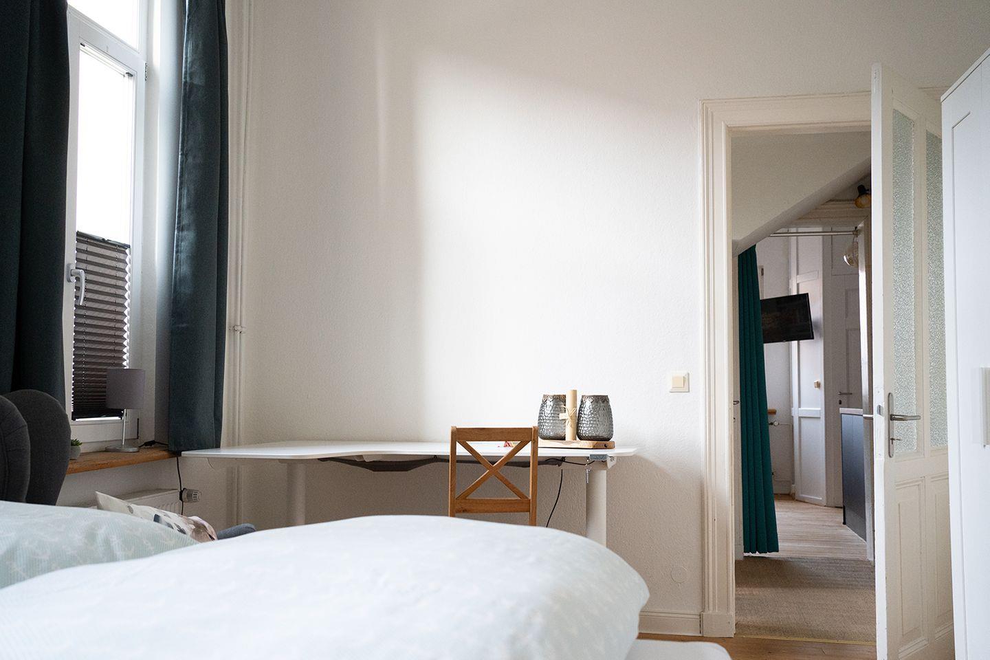Zum ruhig gelegenen Hof des Hauses finden Sie das großzügige Schlafzimmer mit einem Doppelbett und Zugang zum Badezimmer mit bodentiefer Dusche und Fenster.