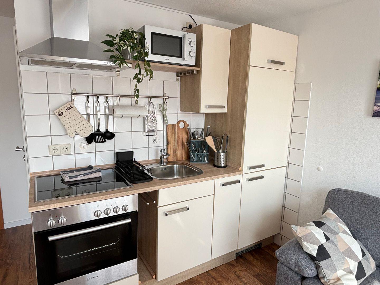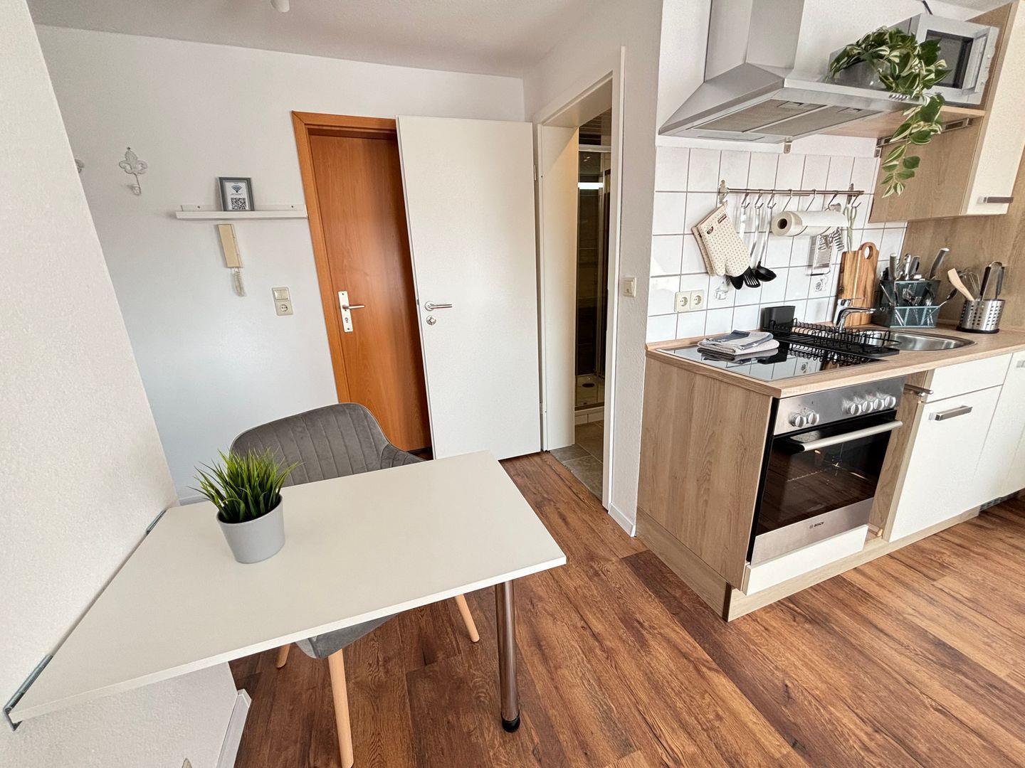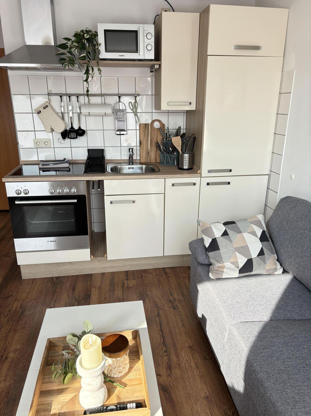 Die Wohnung hat eine Größe von ca. 28m² und ist unterteilt in Wohnzimmer, Schlafzimmer, Kochecke sowie einem frisch renoviertem Dusch-Badezimmer und einem Abstellraum, sie ist für max. eine Person geeignet. Das vorhandene Bett im Schlafzimmer hat eine Größe von 1,20 x 2,00m. In der Küche stehen Elektrogeräte wie z. B. Kaffeemaschine, Wasserkocher, Backofen, Mikrowelle, Toaster sowie eine Kochgelegenheit (mit 4 Herdplatten) zur Verfügung. Selbstverständlich ist auch ein Smart-TV und ein Radio vorhanden. Darüber hinaus besteht die Möglichkeit einen klappbaren Tisch im Wohnraum fürs Speisen oder auch Bürotätigkeiten zu nutzen.