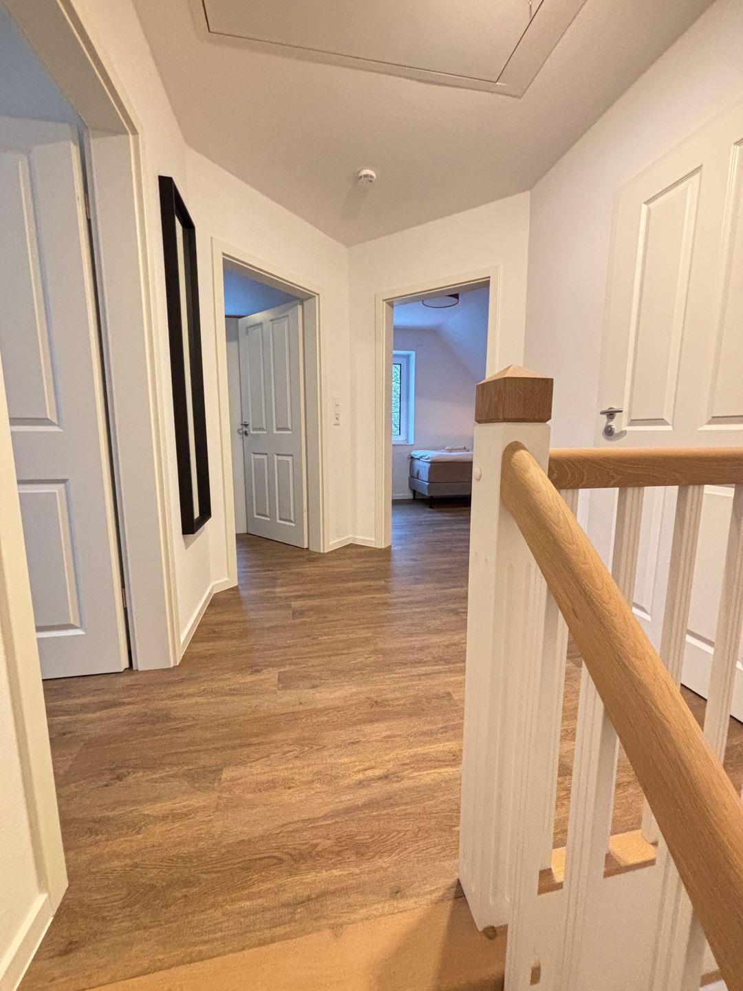 Zwei komfortabel ausgestattete Badezimmer bieten eine hochwertige Sanitärausstattung – darunter ein bodengleiches Duschbad und eine Badewanne im oberen Badezimmer. Haartrockner, Spiegel, Fenster und warmes Wasser runden das Angebot ab. Selbstverständlich stehen kostenfreie Bettwäsche, Handtücher und eine Erstausstattung in Küche und Bad bereit.