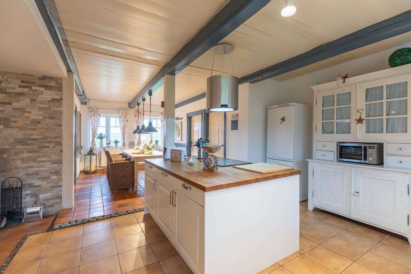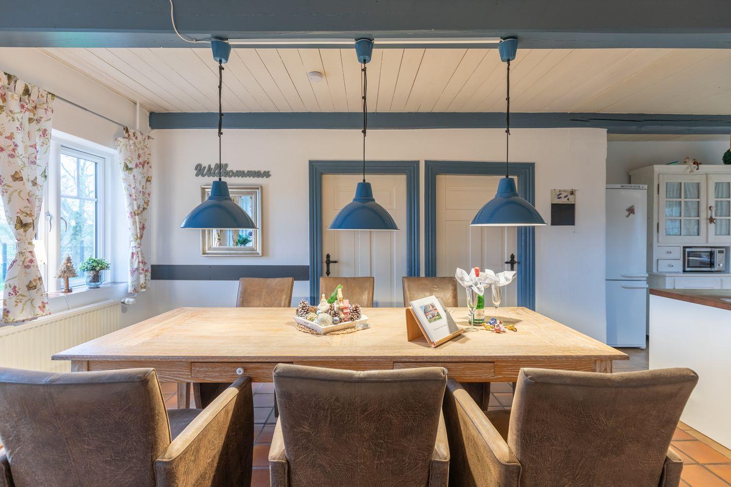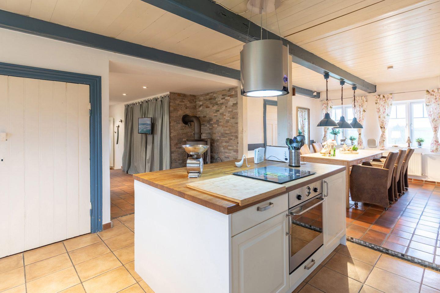 Der große Esstisch lädt zu gemütlichen Abenden im Kreise der Freunde oder Familie ein. Die offene Küche ist mit einem Geschirrspüler, Herd, Backofen, Filterkaffeemaschine, Toaster, Wasserkocher, einer Mikrowelle und einem Kühlschrank mit Gefrierfach ausgestattet.