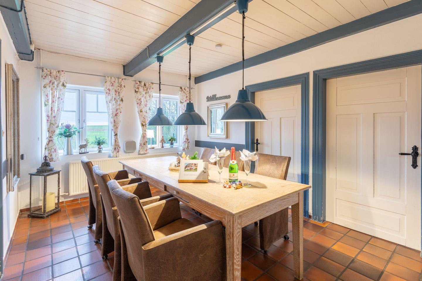 Nur wenige Schritte zum Wattenmeer, auf einer kleinen Warft direkt am Deich gelegen, gehört das ca. 1760 als Deputatenhaus erbaute 'Juwel am Deich'. Auf dem 1800 qm großen, eingezäunten Grundstück lässt es sich uneingeschränkt entspannen und Ihren Urlaub bei den Nordfriesen genießen.