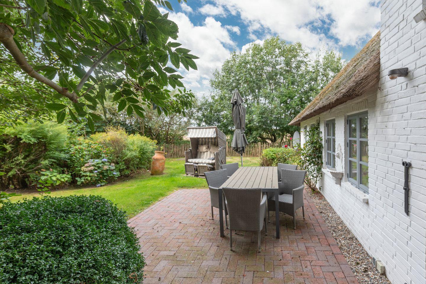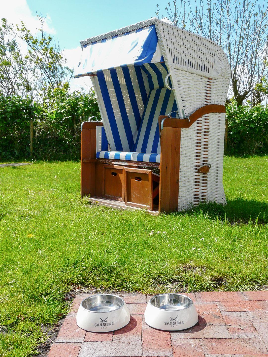 Auf der sonnigen Terrasse mit den Gartenmöbeln, zwei Strandkörben und einem Grill können Sie den Tag entspannt ausklingen lassen.