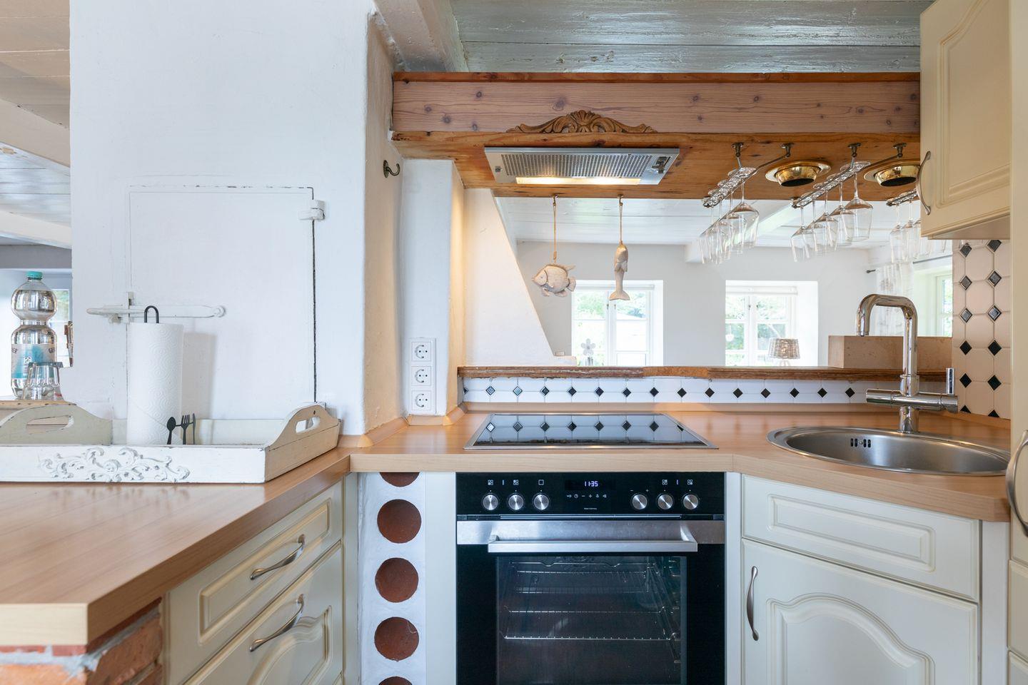 Die offene Küche ist mit einem Geschirrspüler, Herd, Backofen, einer Mikrowelle und einem Kühlschrank mit Gefrierfach ausgestattet. Ebenfalls zur Küchenausstattung gehören Grohe Blue Wasserfiltertechnik für gekühltes Mineralwasser (still/medium), Nescafé Dolce Gusto und normale Kaffeemaschine, Toaster, Wasserkocher, Eierkocher, Mixer, Waffeleisen, Besteck und Geschirr in 12-facher Ausfertigung und Gläser in allen Variationen. Der große Esstisch lädt zu gemütlichen Abenden im Kreise der Freunde oder Familie ein. Eine Waschmaschine steht Ihnen zur Verfügung.