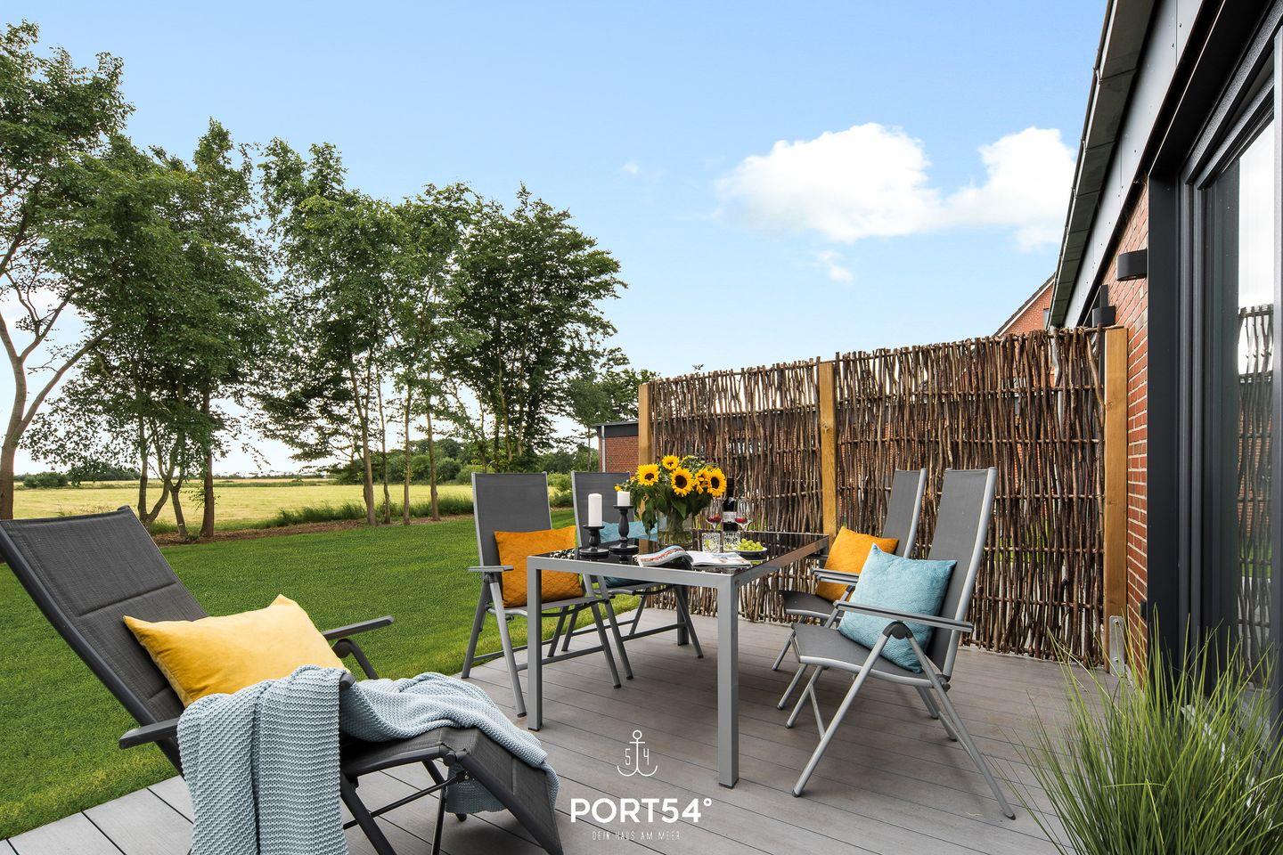 Das Wohnzimmer lädt zu gemütlichen Stunden ein. Die Küche ist modern und voll ausgestattet, sodass Sie hier wunderbar kochen können. Das Schlafzimmer ist hochwertig eingerichtet und verfügt über ein Doppelbett (180cmx200cm). Für weitere 2 Personen steht im Wohnzimmer ein gemütliches Schlafsofa zur Verfügung. Das helle Badezimmer hat eine Dusche. Die gesamte Wohnung verfügt über eine Fußbodenheizung. Auf der angrenzenden Sonnenterrasse mit einem Gemeinschaftsgarten können Sie herrliche Stunden an der frischen Nordseeluft verbringen und gemeinsame Grillabende veranstalten. Ein Elektrogrill steht Ihnen dafür zu Verfügung.