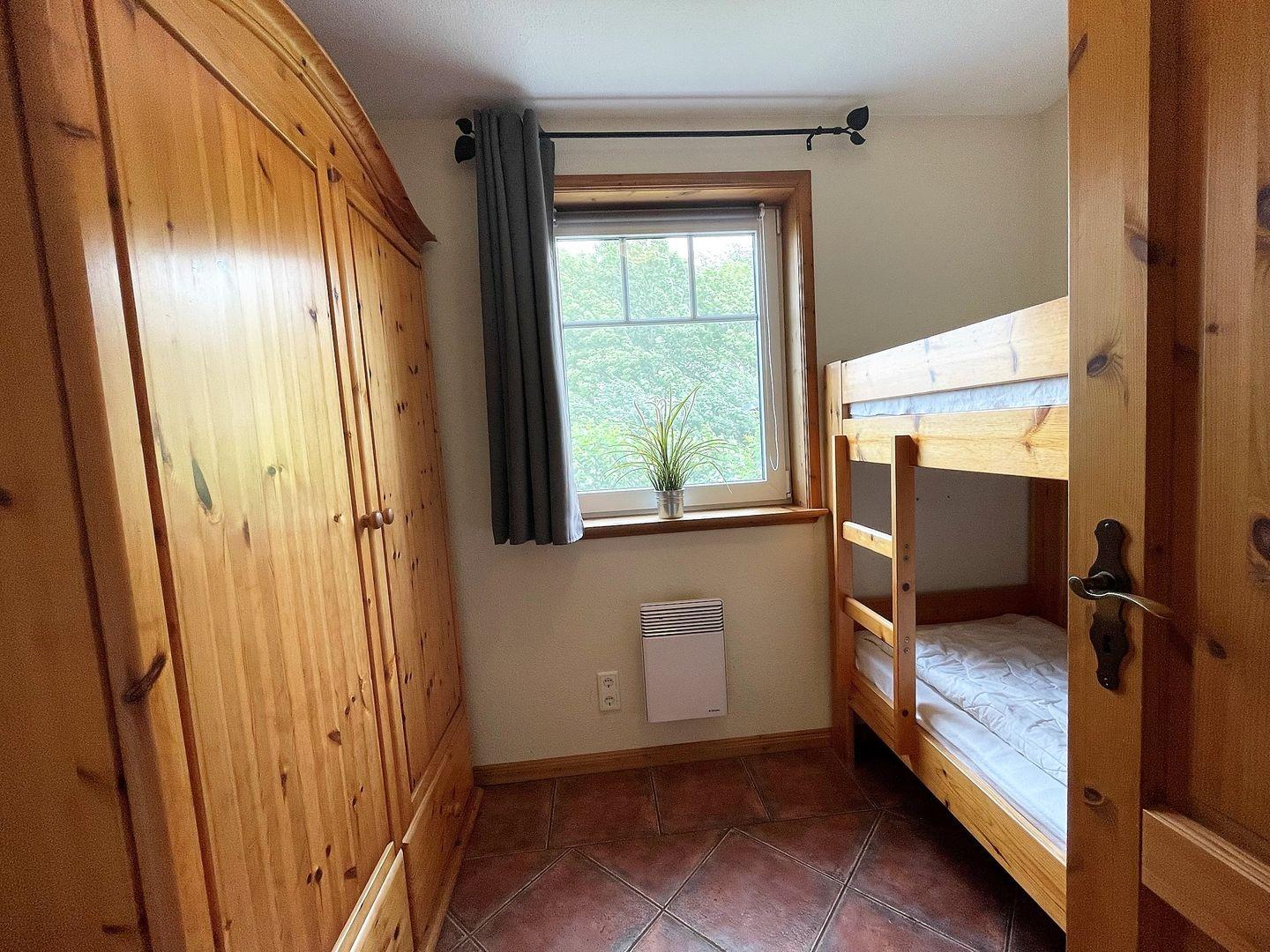 Schlafen Sie in 2 gemütlichen Schlafzimmern. Das Elternschlafzimmer verfügt über ein Doppelbett (140x200cm) und das Kinderzimmer ist mit einem Etagenbett (80x190cm) ausgestattet.