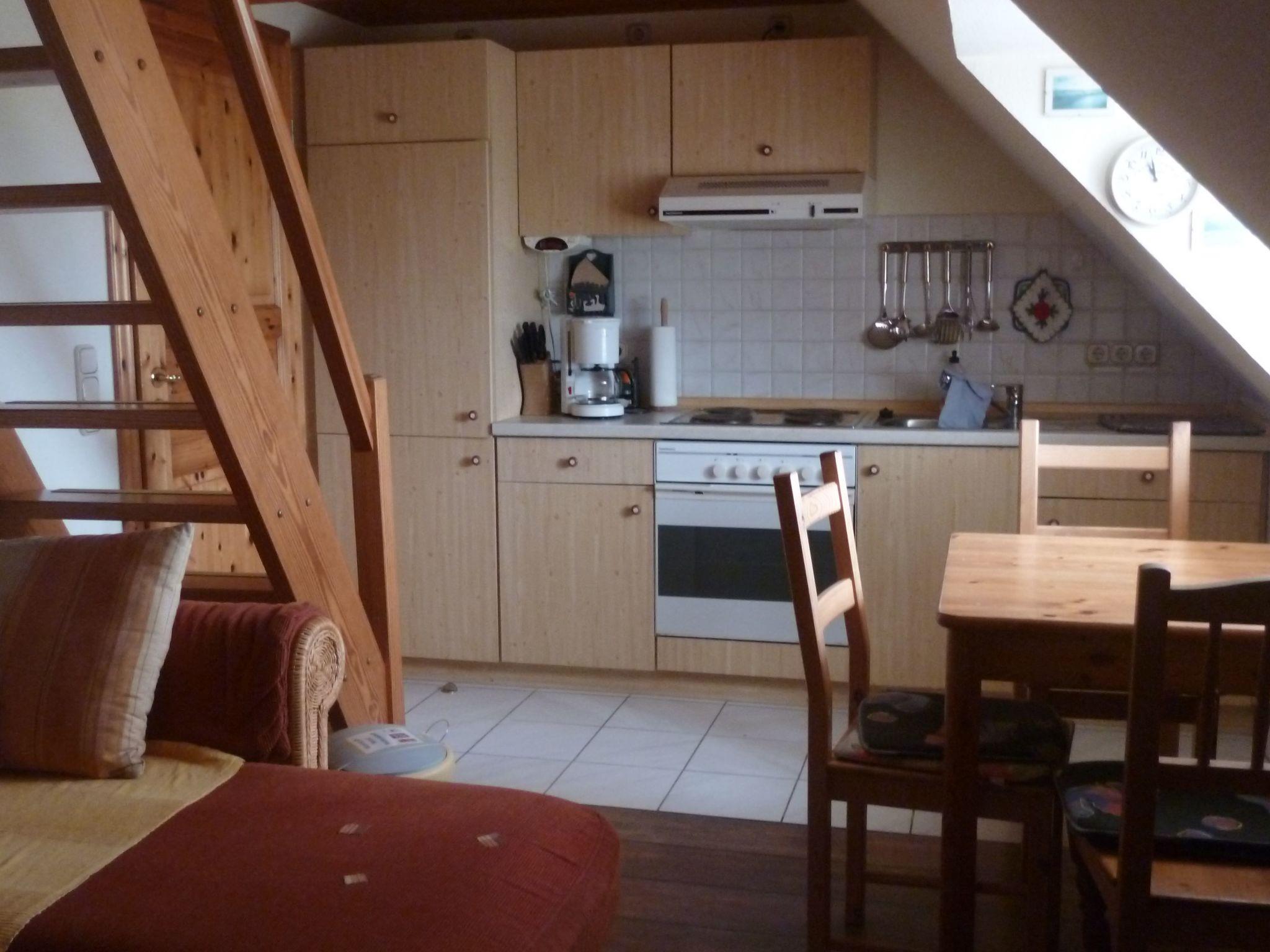 Das Apartment hat eine Küchenzeile von 3 m mit Backofen und 4 Plattenherd und eine Schlafcouch, Tisch mit 4 Stühlen. Schrank ist im Flur und Bad ist auch über den kleinen Flur. Es ist ein offener Schlafraum und mit einem 1,40 m x 2,00 m Bett ausgestattet und einem 90 cm x 200 cm Bett zusätzlich, alles im Schrägdach im orginal Friesenhaus