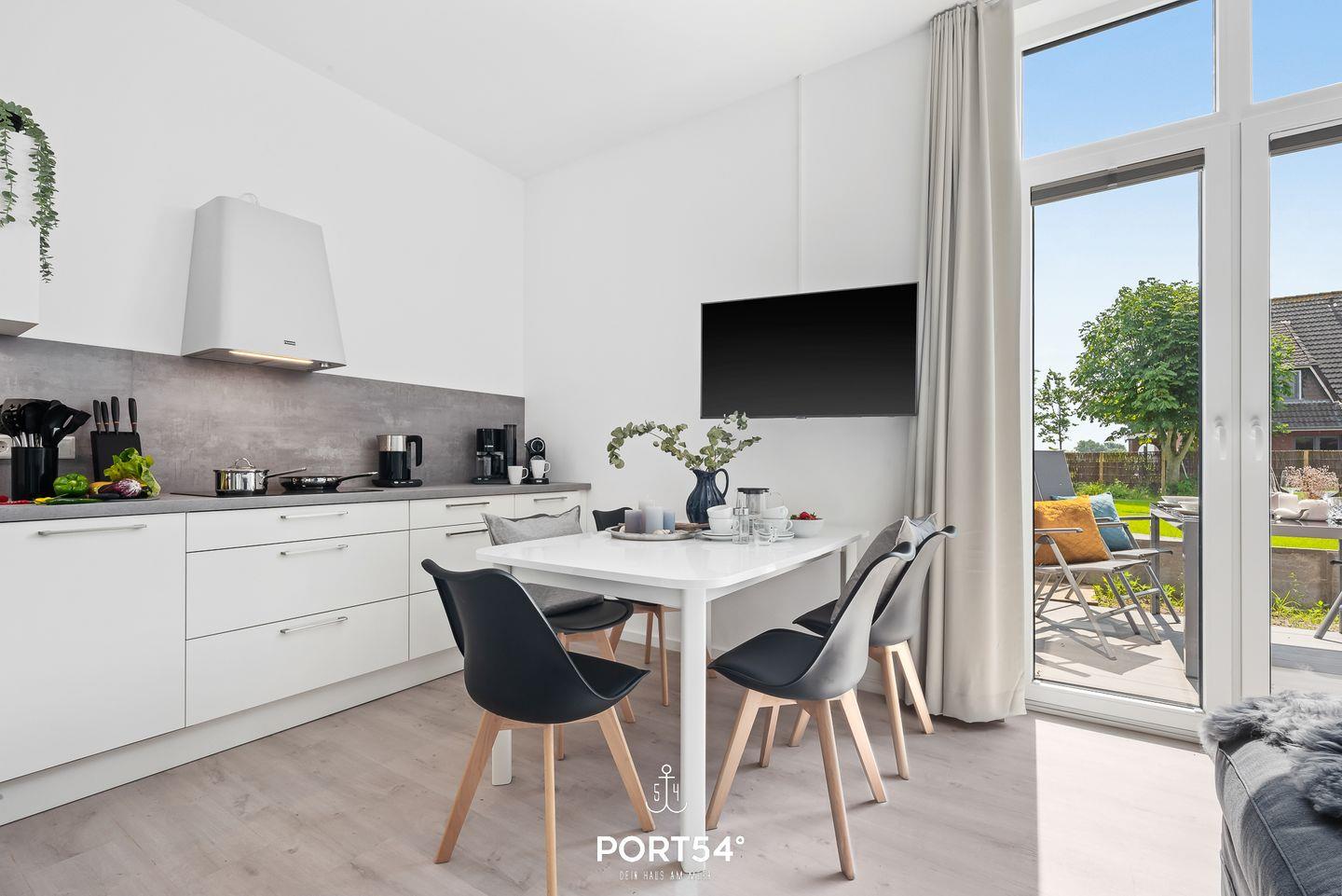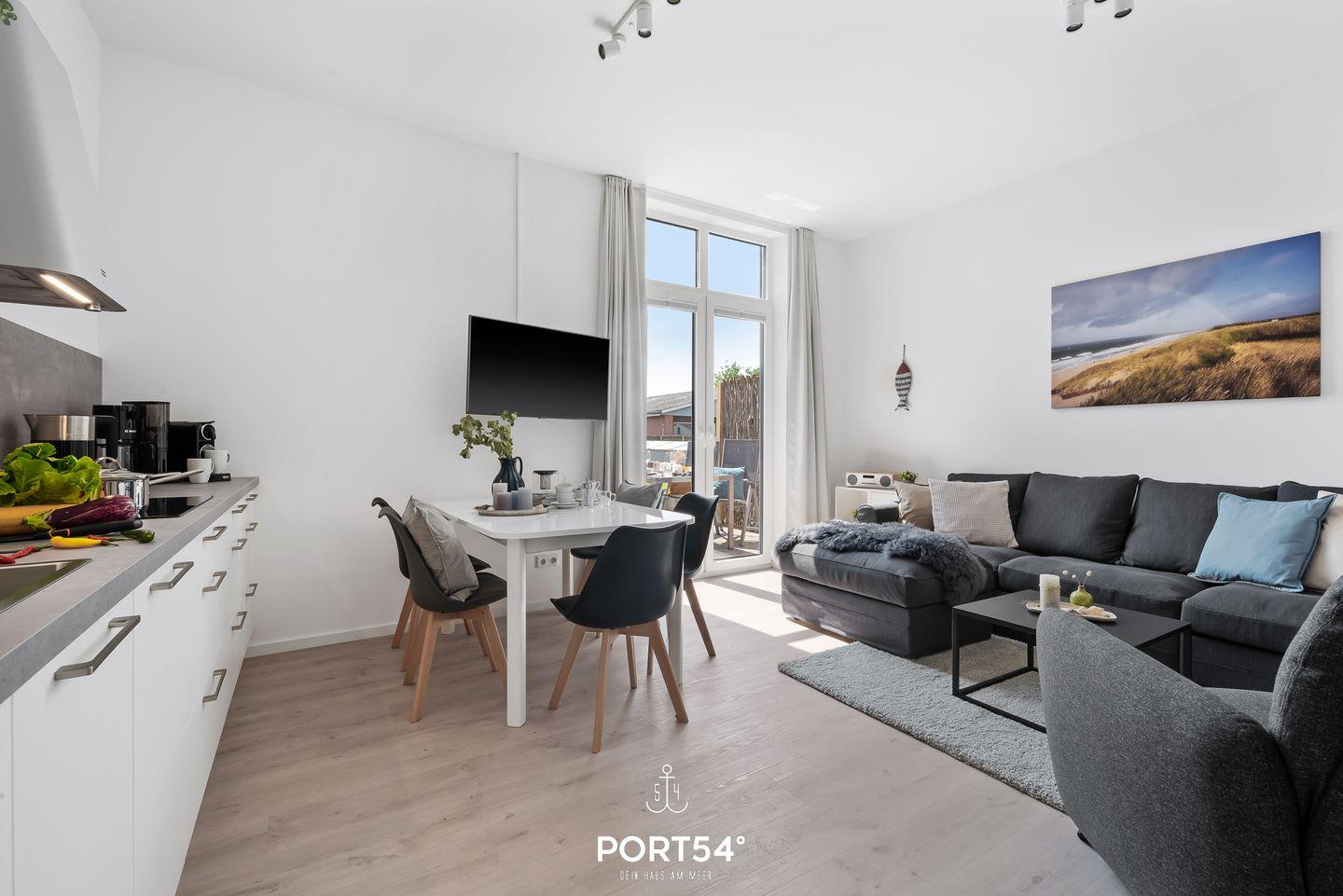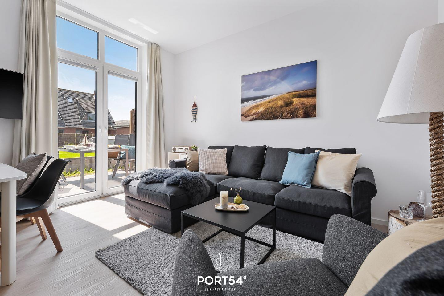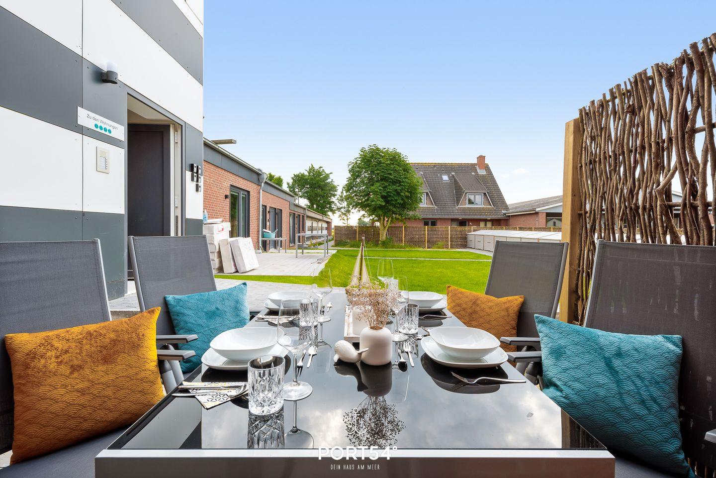 In dem geräumigen und lichtdurchfluteten Wohnzimmer können Sie es sich gemütlich machen. Die offene Küche ist modern und voll ausgestattet, sodass Sie hier wunderbar gemeinsam kochen können. Die Schlafzimmer sind hochwertig eingerichtet, eins der Schlafzimmer verfügt über ein Doppelbett (180x200cm), die anderen beiden über ein Einzelbett mit Auszug. Eine weitere Schlafmöglichkeit für 2 Personen bietet das Schlafsofa im gemütlichen Wohnzimmer. Das helle und stilvolle Badezimmer ist mit einer Dusche ausgestattet. Auf der angrenzenden Sonnenterrasse mit Gemeinschaftsgarten können Sie herrliche Stunden an der frischen Nordseeluft verbringen. Ein Elektrogrill steht Ihnen für gesellige Grillabende zur Verfügung.