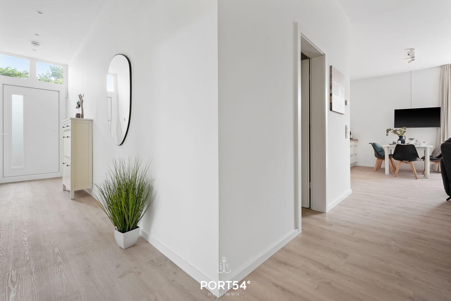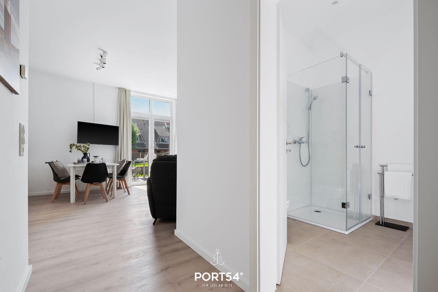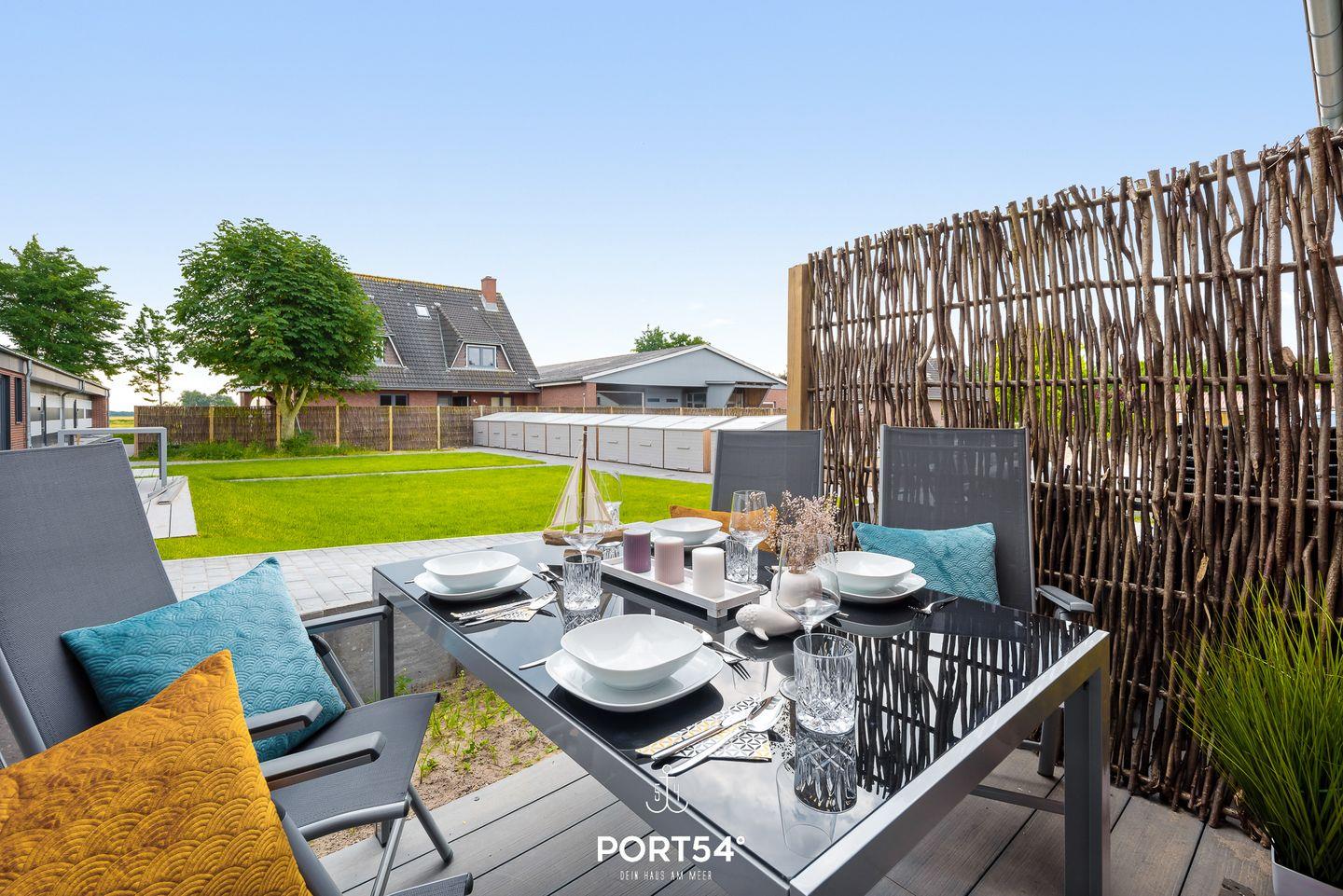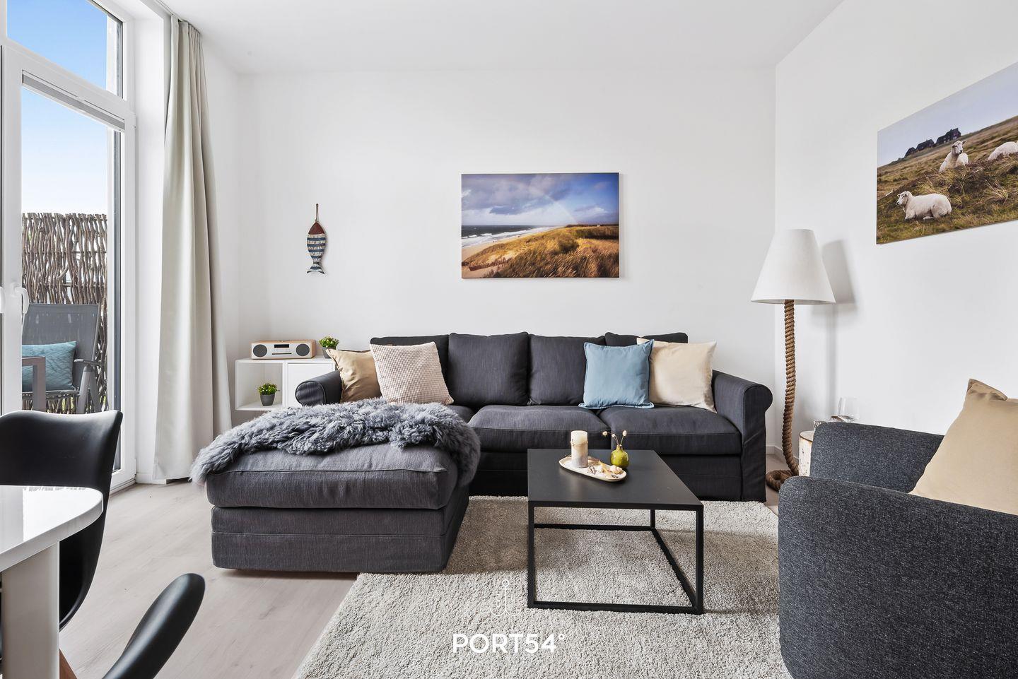 In dem geräumigen und lichtdurchfluteten Wohnzimmer können Sie es sich gemütlich machen. Die offene Küche ist modern und voll ausgestattet, sodass Sie hier wunderbar gemeinsam kochen können. Die Schlafzimmer sind hochwertig eingerichtet, eins der Schlafzimmer verfügt über ein Doppelbett (180x200cm), die anderen beiden über ein Einzelbett mit Auszug. Eine weitere Schlafmöglichkeit für 2 Personen bietet das Schlafsofa im gemütlichen Wohnzimmer. Das helle und stilvolle Badezimmer ist mit einer Dusche ausgestattet. Auf der angrenzenden Sonnenterrasse mit Gemeinschaftsgarten können Sie herrliche Stunden an der frischen Nordseeluft verbringen. Ein Elektrogrill steht Ihnen für gesellige Grillabende zur Verfügung.