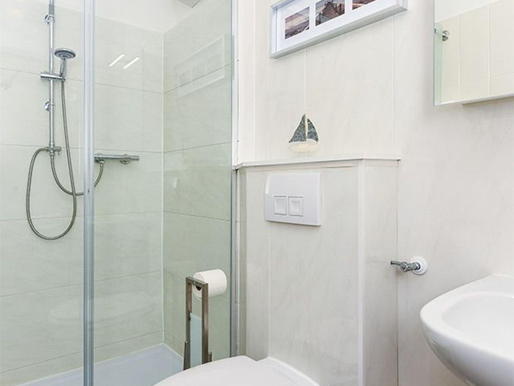 Badezimmer mit Dusche, Waschtisch und WC
