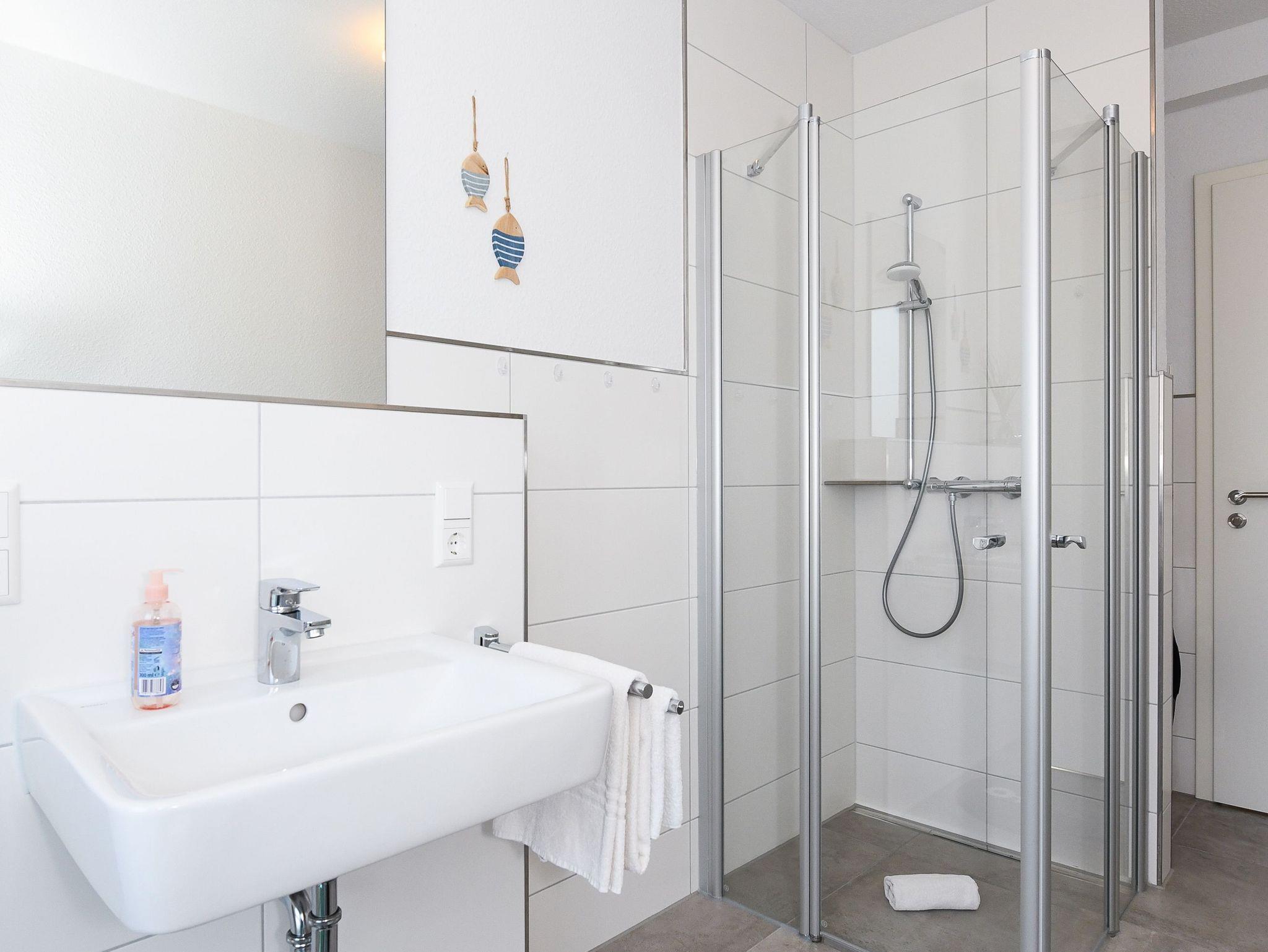 Badezimmer mit Dusche, Waschtisch und WC