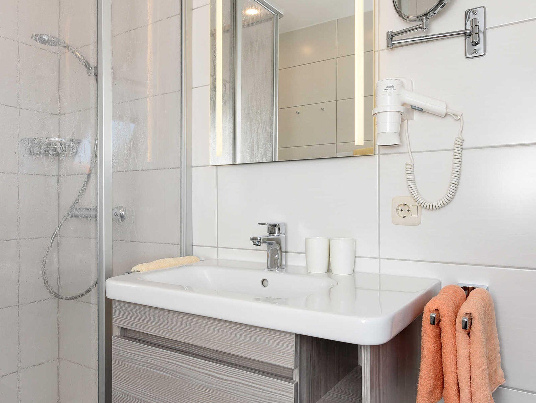 Badezimmer mit Dusche, Waschtisch und WC