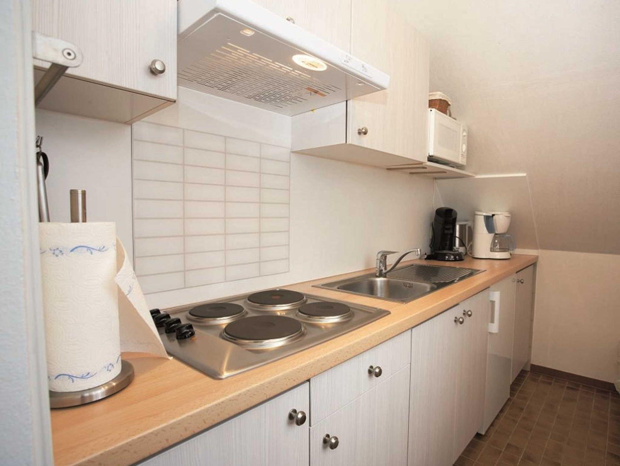 Im Wohnraum lädt eine gemütliche Couch zum Relaxen, Lesen oder Fernsehen ein. Die Fewo verfügt über einen Flachbildschirm und Radio. Die kleine Küche beinhaltet alles was man zum Kochen braucht, auch Ceranfeld, Mikrowelle, Filtermaschine und Senseo-Kaffeemaschine.Das Badezimmer ist mit einer Dusche ausgestattet.