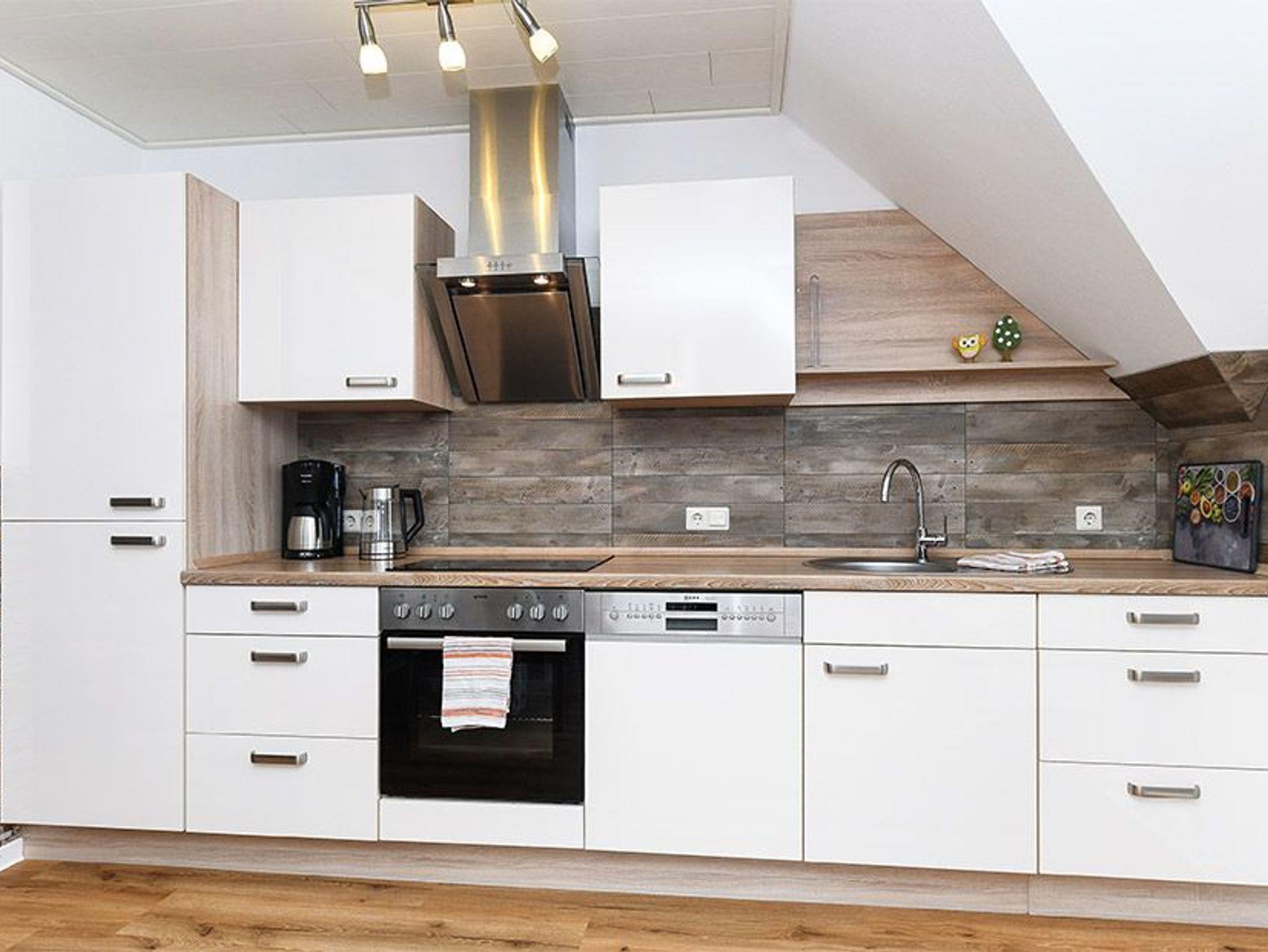 Größe ca. 65 Quadratmeter, Wohnzimmer mit integrierter Küche, Schlafzimmer, zweites separates Schlafzimmer/Kinderzimmer, Badezimmer mit Doppel-Waschbecken, Dusche und WC, Obergeschoss, optimal für 2 bis 4 Personen, seperater Fahrradschuppen zum abschließen.