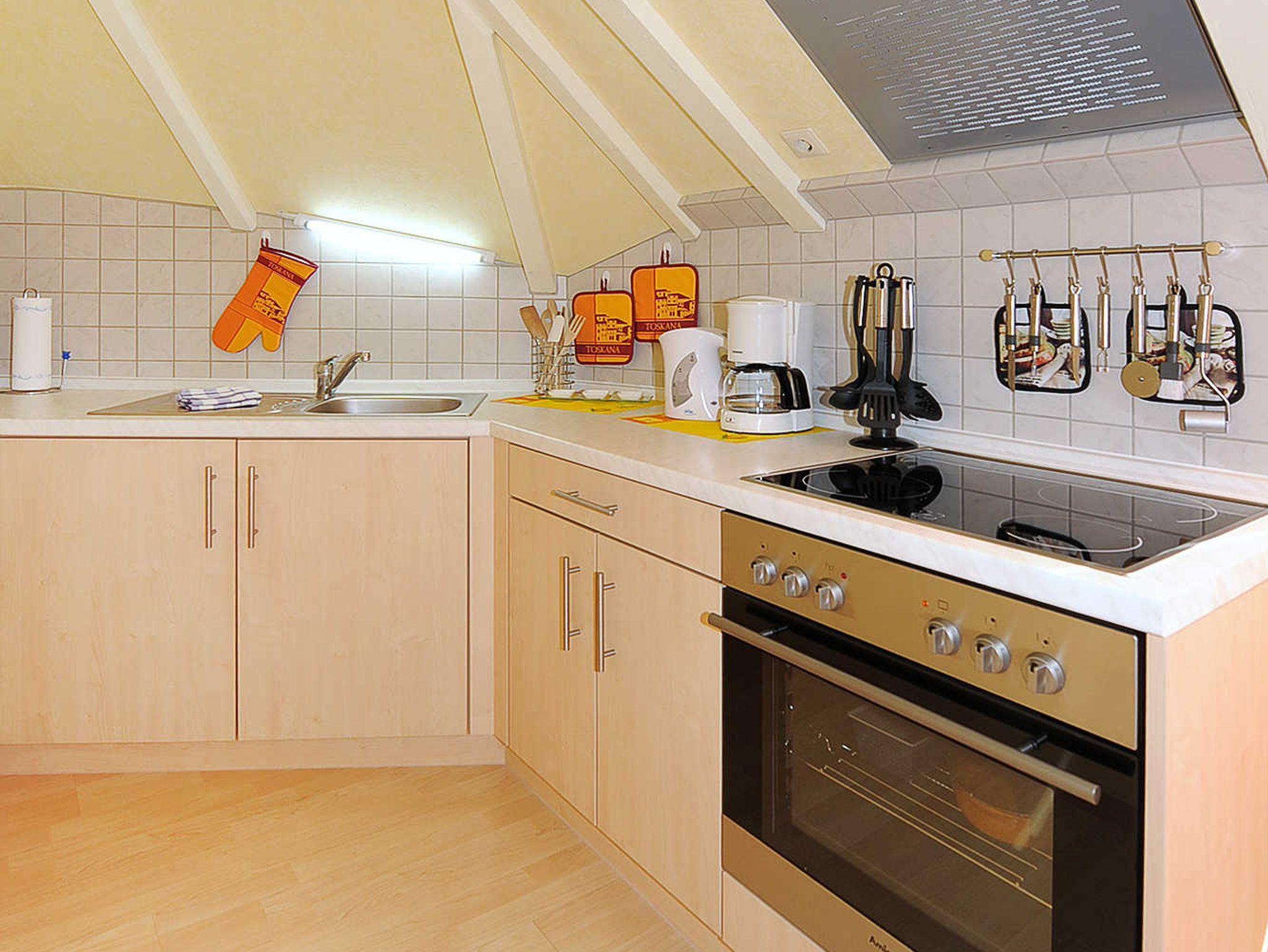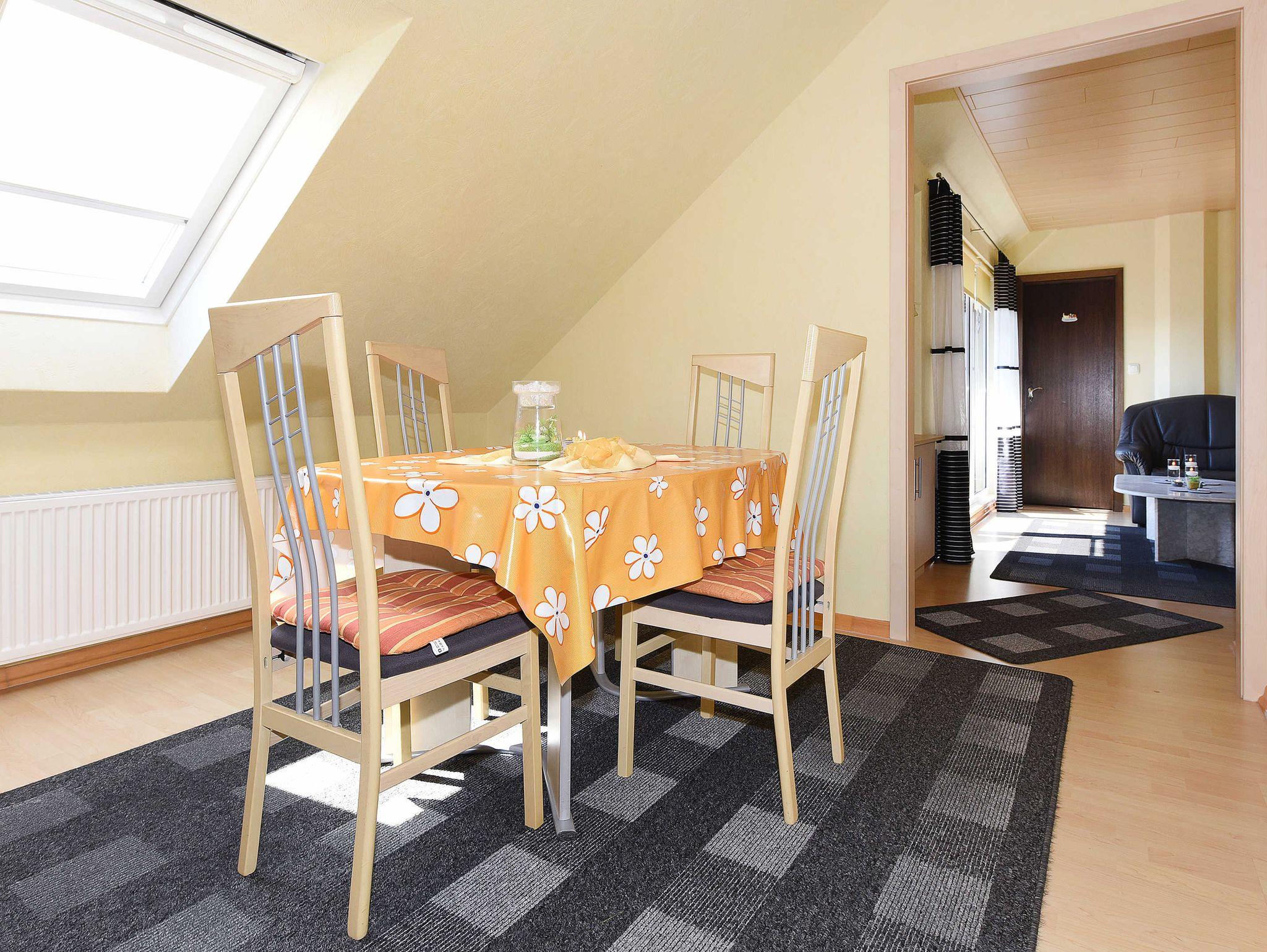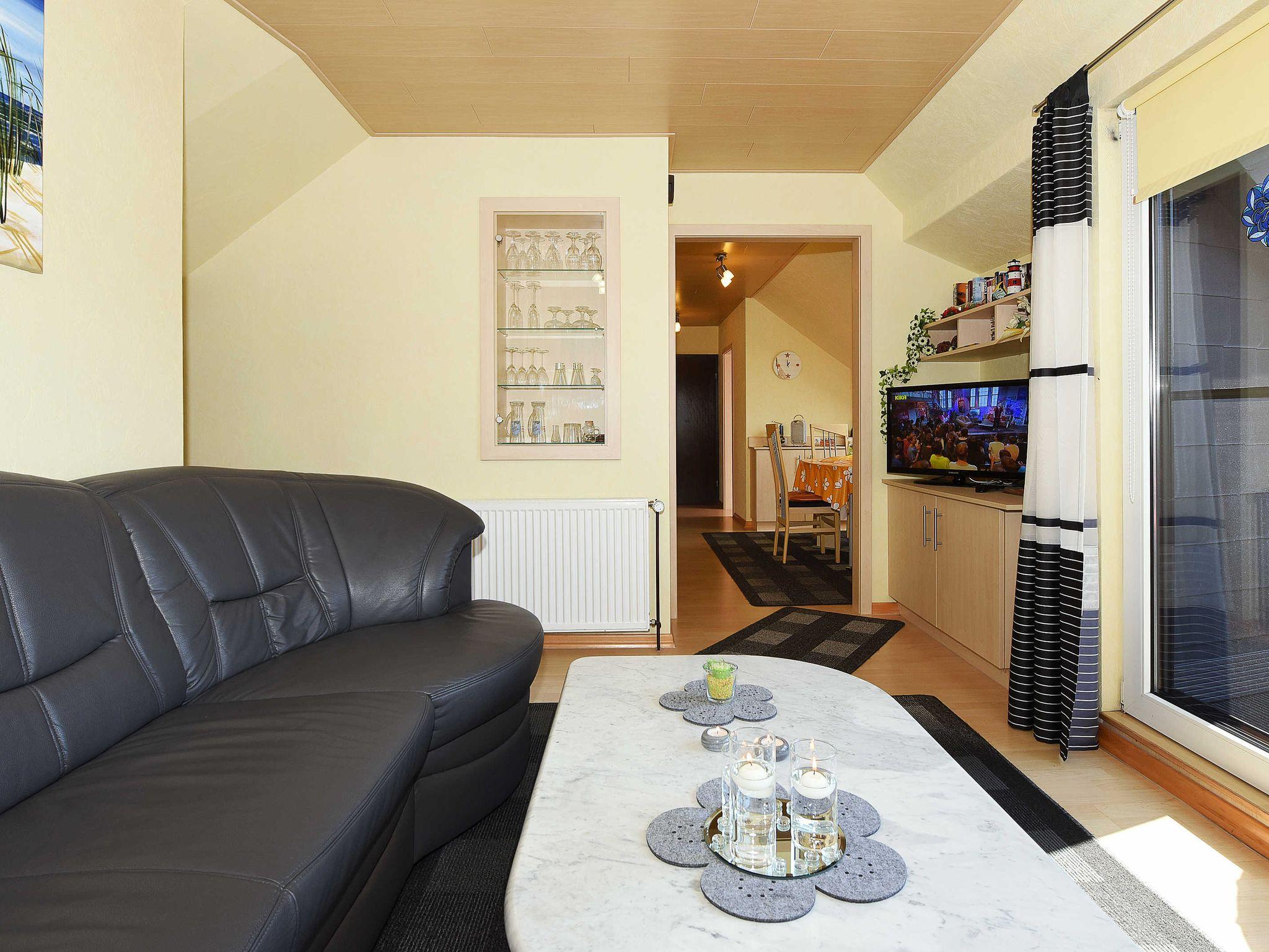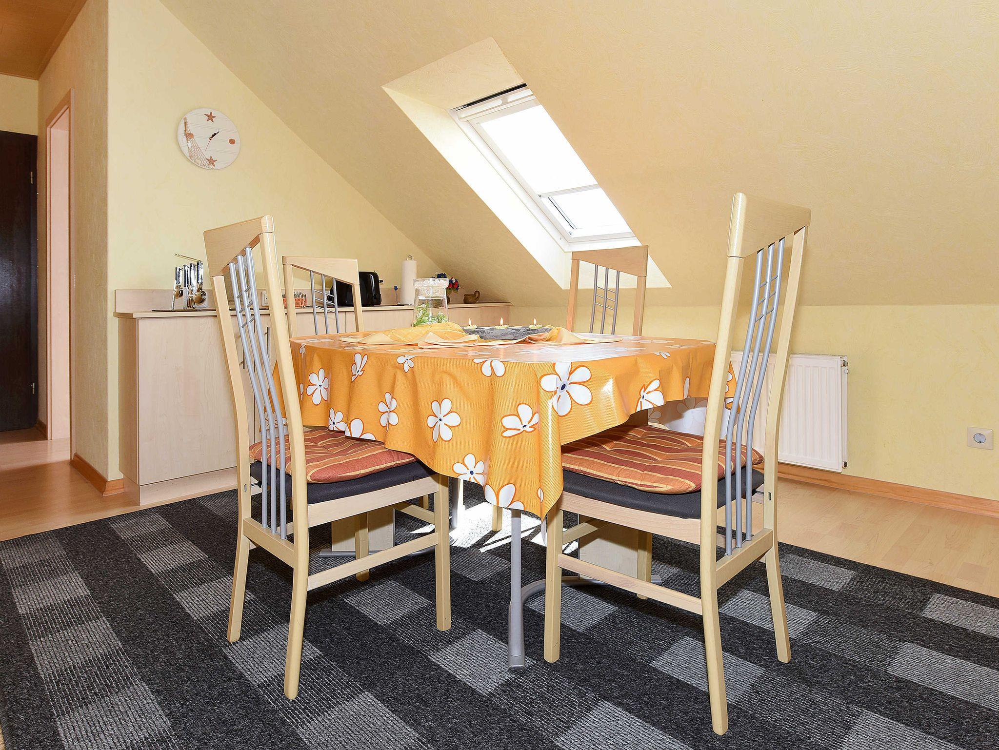 Größe ca. 65 Quadratmeter, Wohnzimmer mit Essgruppe, Küchenabteil, Schlafzimmer, Badezimmer mit Badewanne, Dusche und WC, Obergeschoss, Balkon, optimal für 2 Personen.