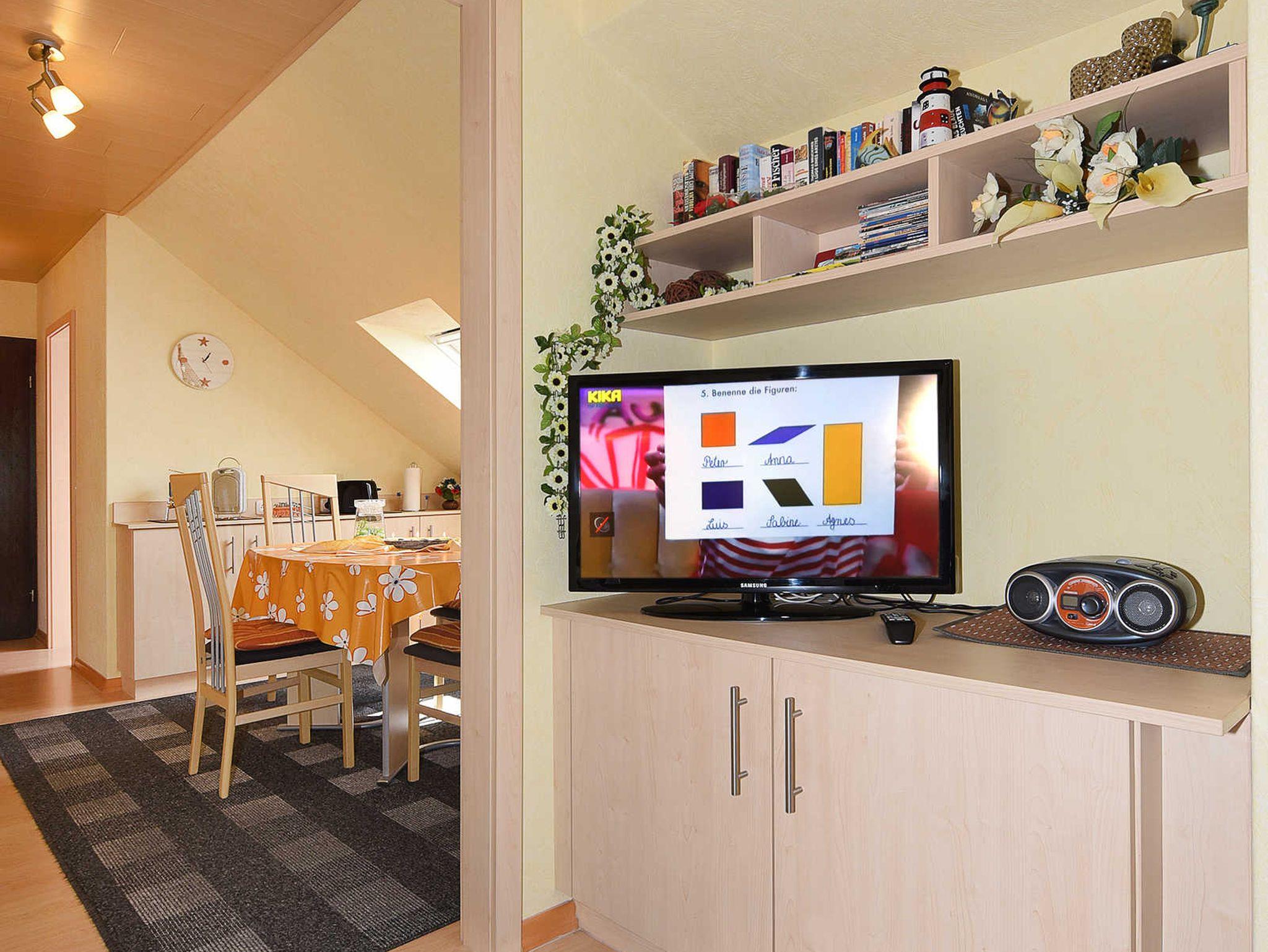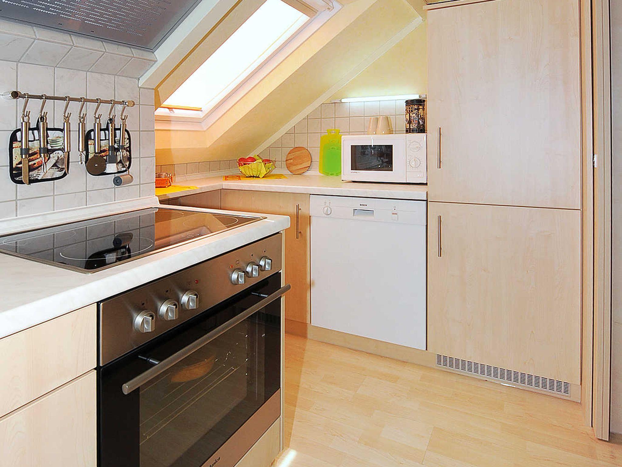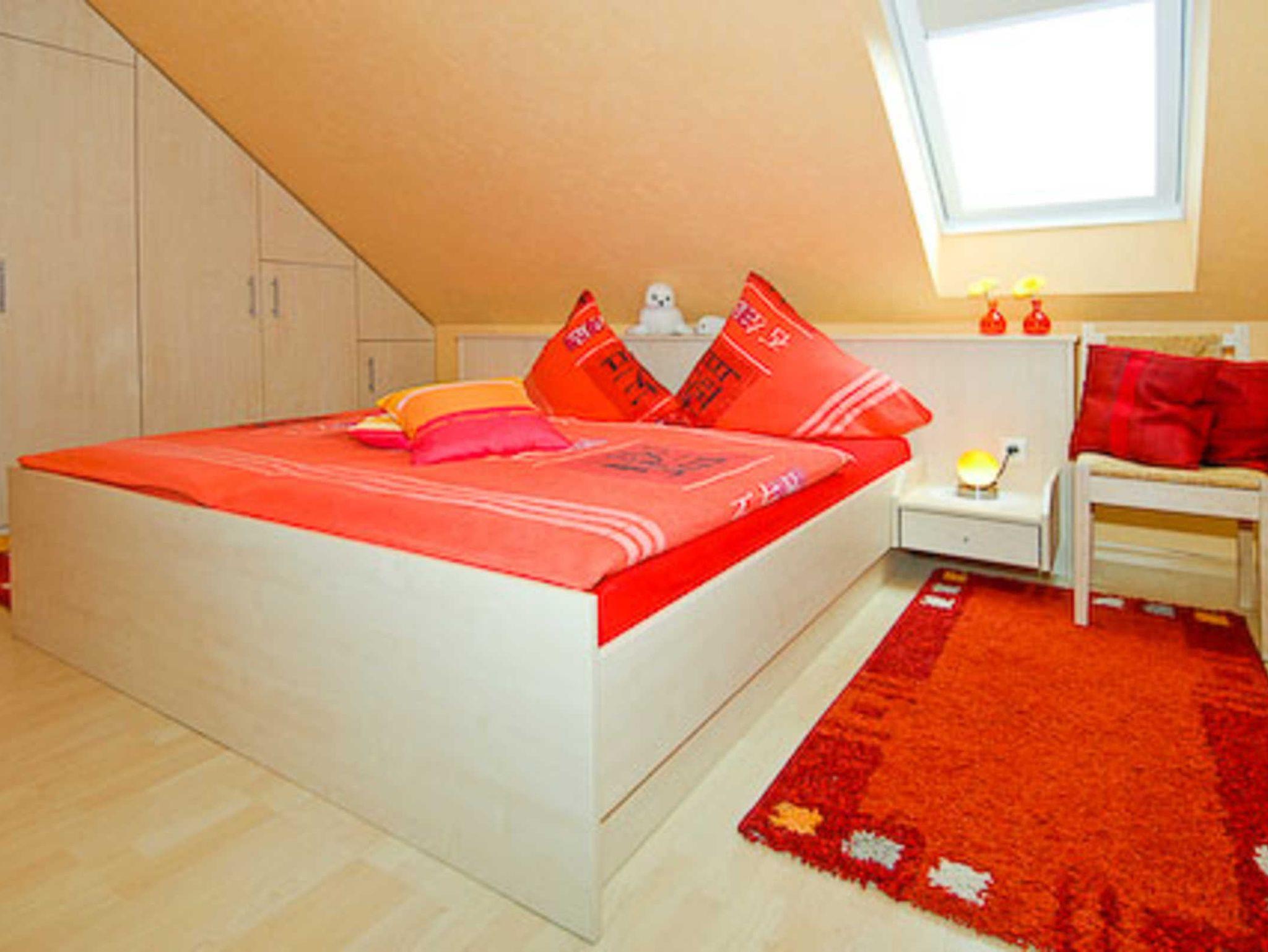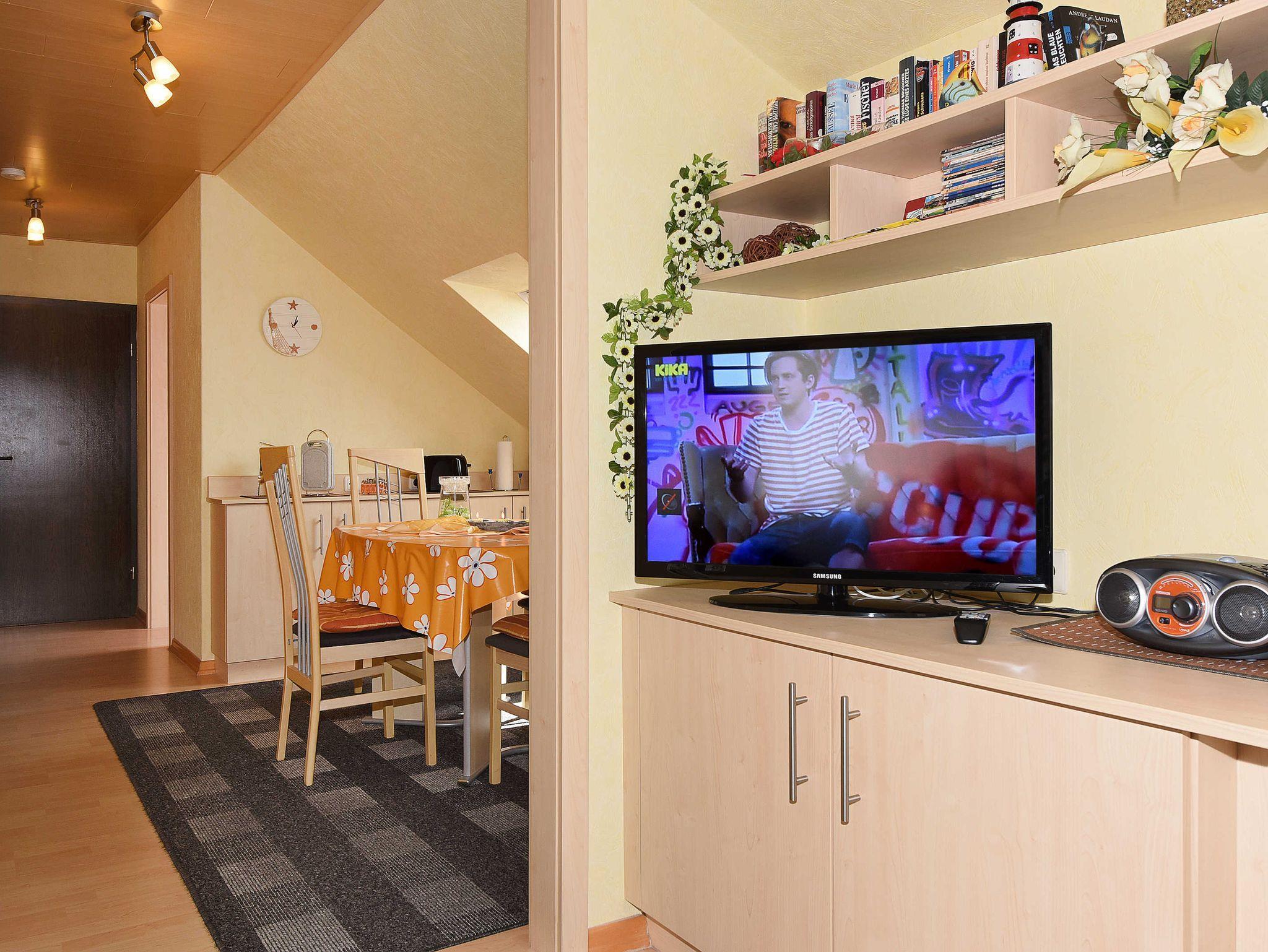 Größe ca. 65 Quadratmeter, Wohnzimmer mit Essgruppe, Küchenabteil, Schlafzimmer, Badezimmer mit Badewanne, Dusche und WC, Obergeschoss, Balkon, optimal für 2 Personen.