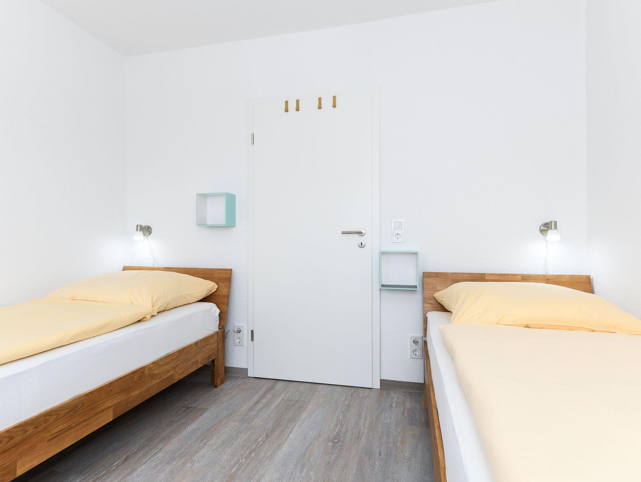Die Erdgeschosswohnung (ca. 69 m²) hat eine Terrasse und bietet mit zwei Schlafzimmern (Eltern/Kinder) Platz für 4 Personen. Die Wohnung im Obergeschoss für 2 Personen (ca. 52 m²) hat einen sonnigen Balkon mit Blick auf den Park und den Deich. Der zweite Schlafraum ist mit einem separaten Zugang und liegt direkt neben der Wohnung.