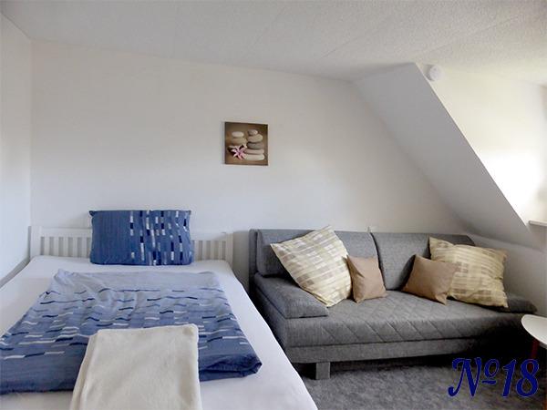 Auf der gleichen Etage befindet sich ein zusätzliches Schlafzimmer, das mit dazu gebucht werden kann. In diesem Zimmer gibt es ein großes Bett (140 x 200 cm), eine Schlafcouch (160 x 200 cm) und ein Kinder-Gitterbett (70 x 140 cm). So hat die Wohnung dann insgesamt zwei Schlafzimmer und kann mit bis zu 4 Erwachsene und / oder Kind(er) belegt.