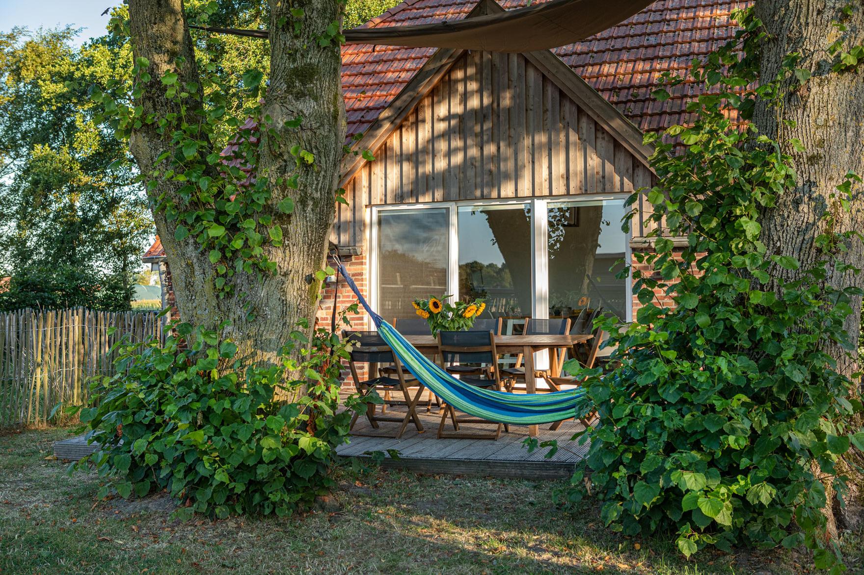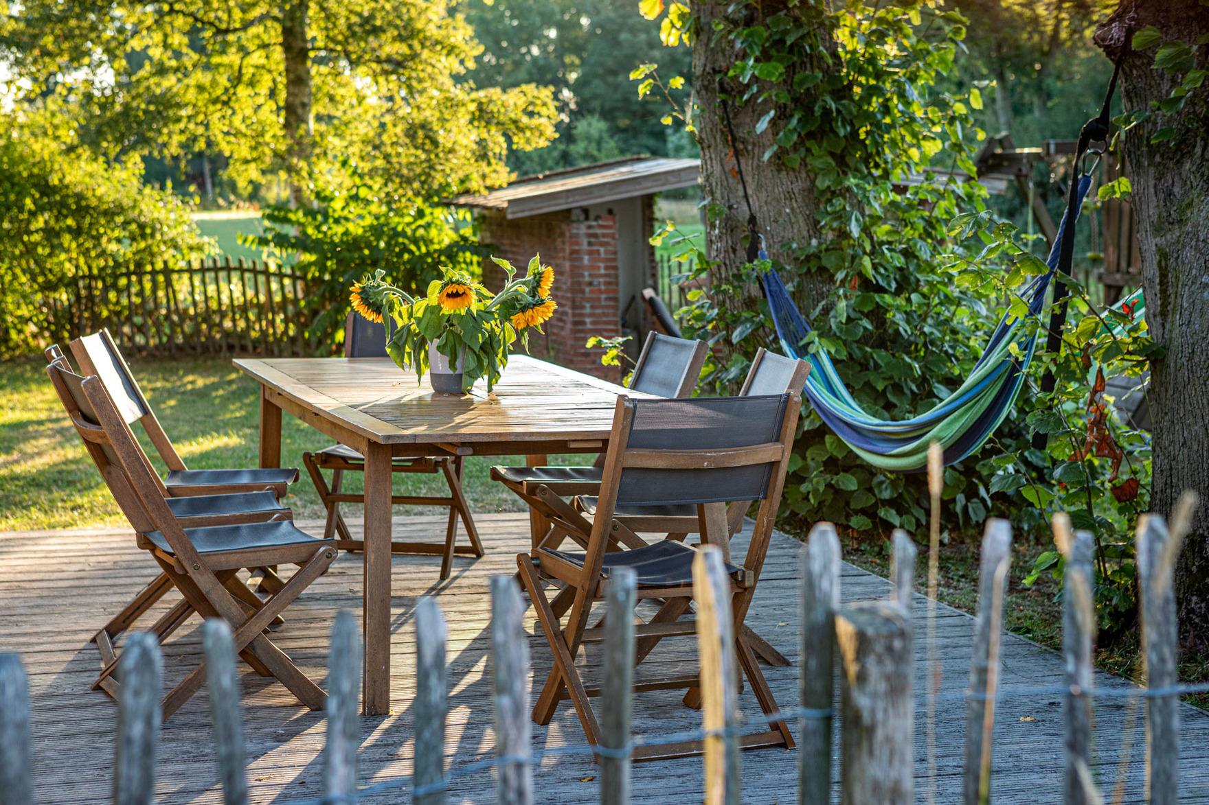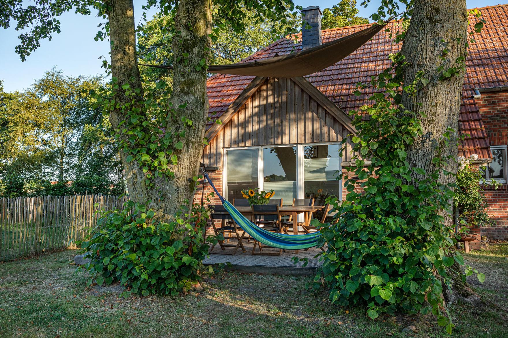 Die Terrasse erhält ihren natürlichen Schatten durch zwei große Linden – so lässt es sich hier auch an heißen Tagen – zum Beispiel in der Hängematte – gut aushalten. In unmittelbarer Nachbarschaft befindet sich eine Pferdekoppel und ein Bauernhof mit Pferde- und Mutterkuhhaltung.