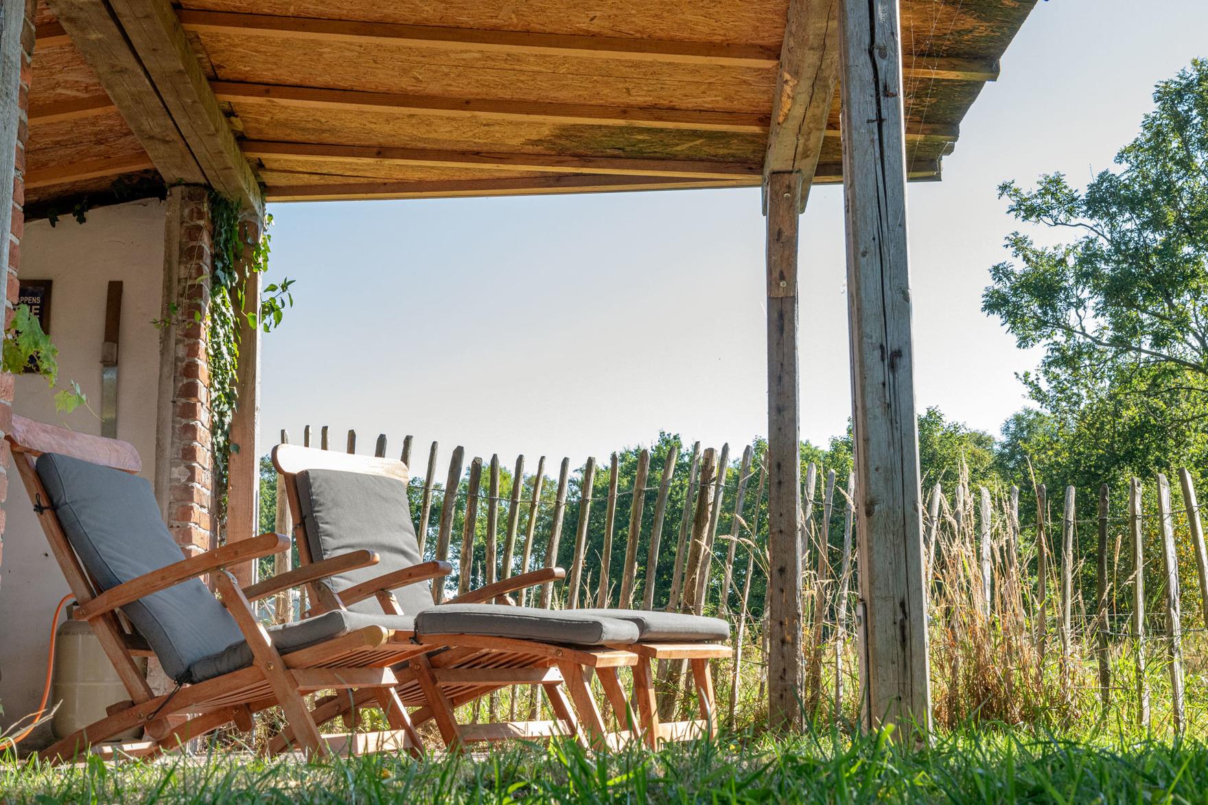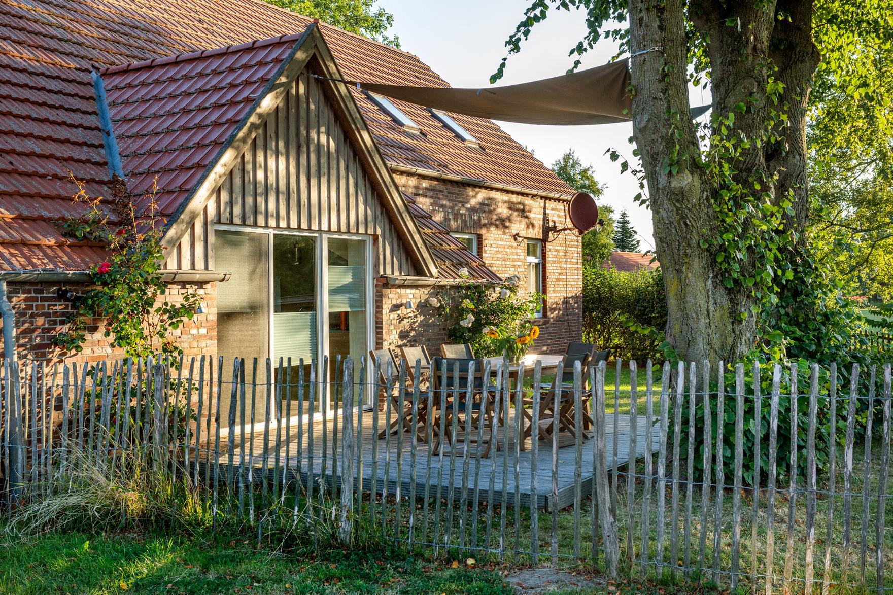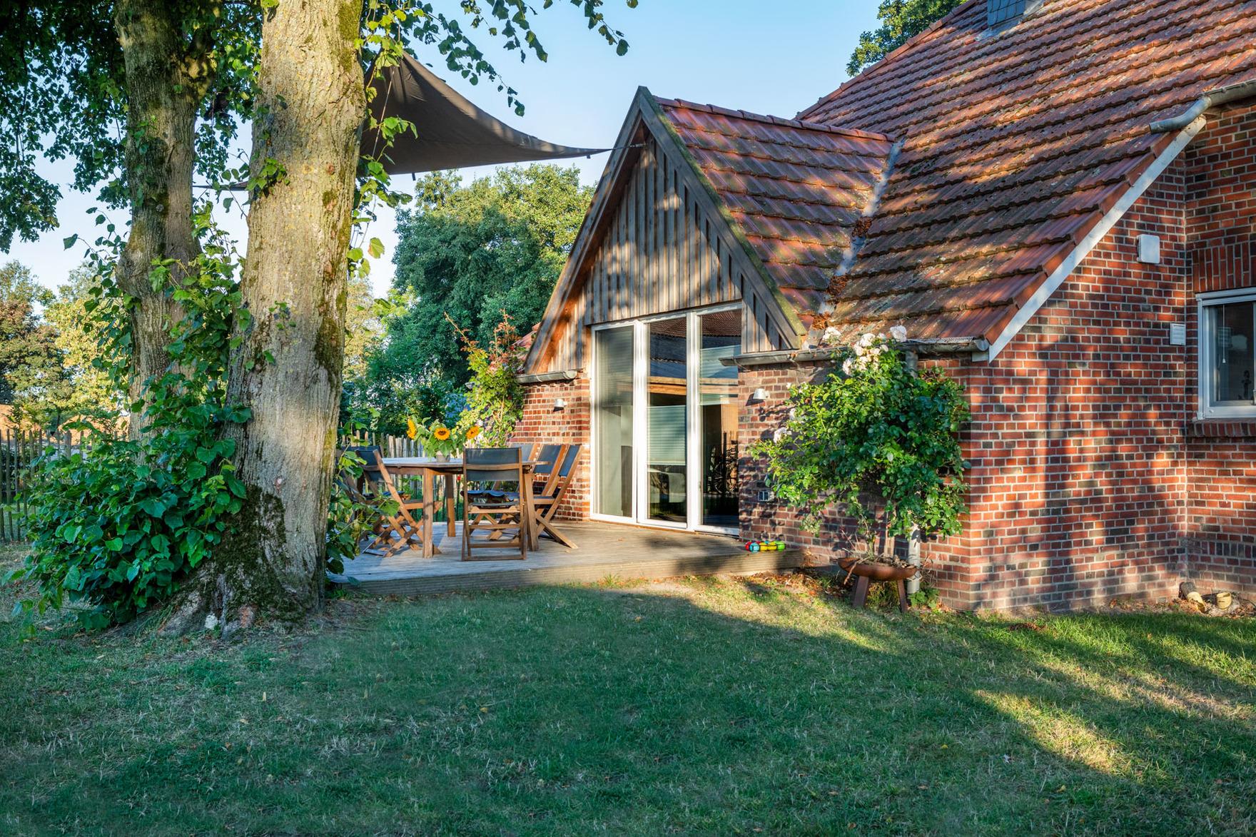 Die Terrasse erhält ihren natürlichen Schatten durch zwei große Linden – so lässt es sich hier auch an heißen Tagen – zum Beispiel in der Hängematte – gut aushalten. In unmittelbarer Nachbarschaft befindet sich eine Pferdekoppel und ein Bauernhof mit Pferde- und Mutterkuhhaltung.