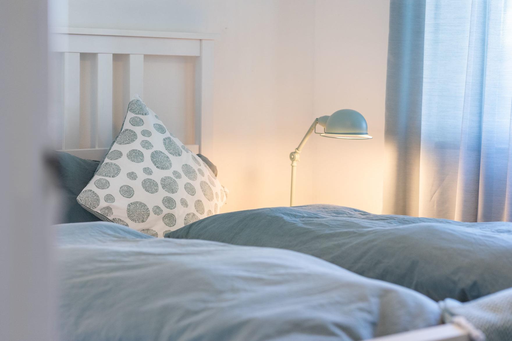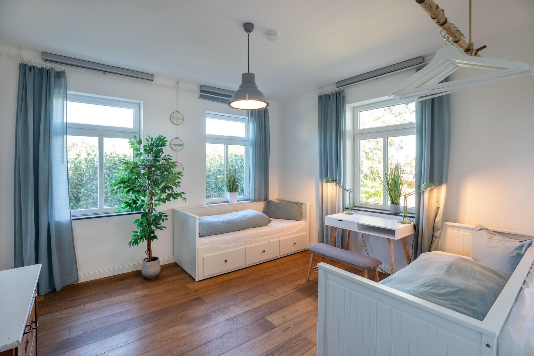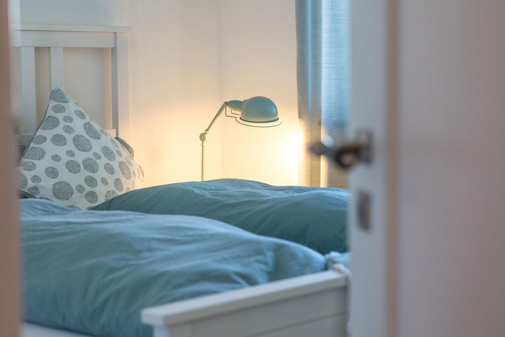 In vier Schlafräumen, davon ein Durchgangszimmer, bieten wir Euch acht Betten (3 Doppel- und 2 Einzelbetten), die zum Einkuscheln und Durchschlafen einladen. Ein Kinderbett kann zusätzlich auf Wunsch gestellt werden. So könnt Ihr mit insgesamt 8 Personen und Kleinkind Urlaub bei uns machen. Noch ein Freund mehr, der unbedingt mit muss? Das Sofa im Wohnraum (120 x 200 cm) ist zum Schlafen geeignet, sagt einfach Bescheid!