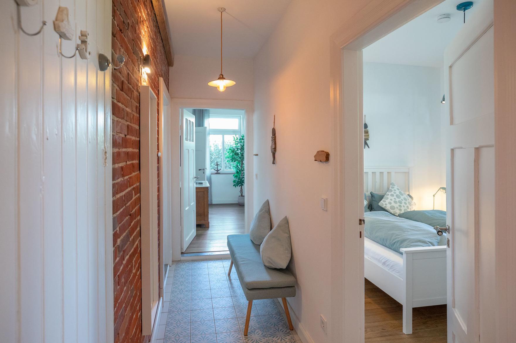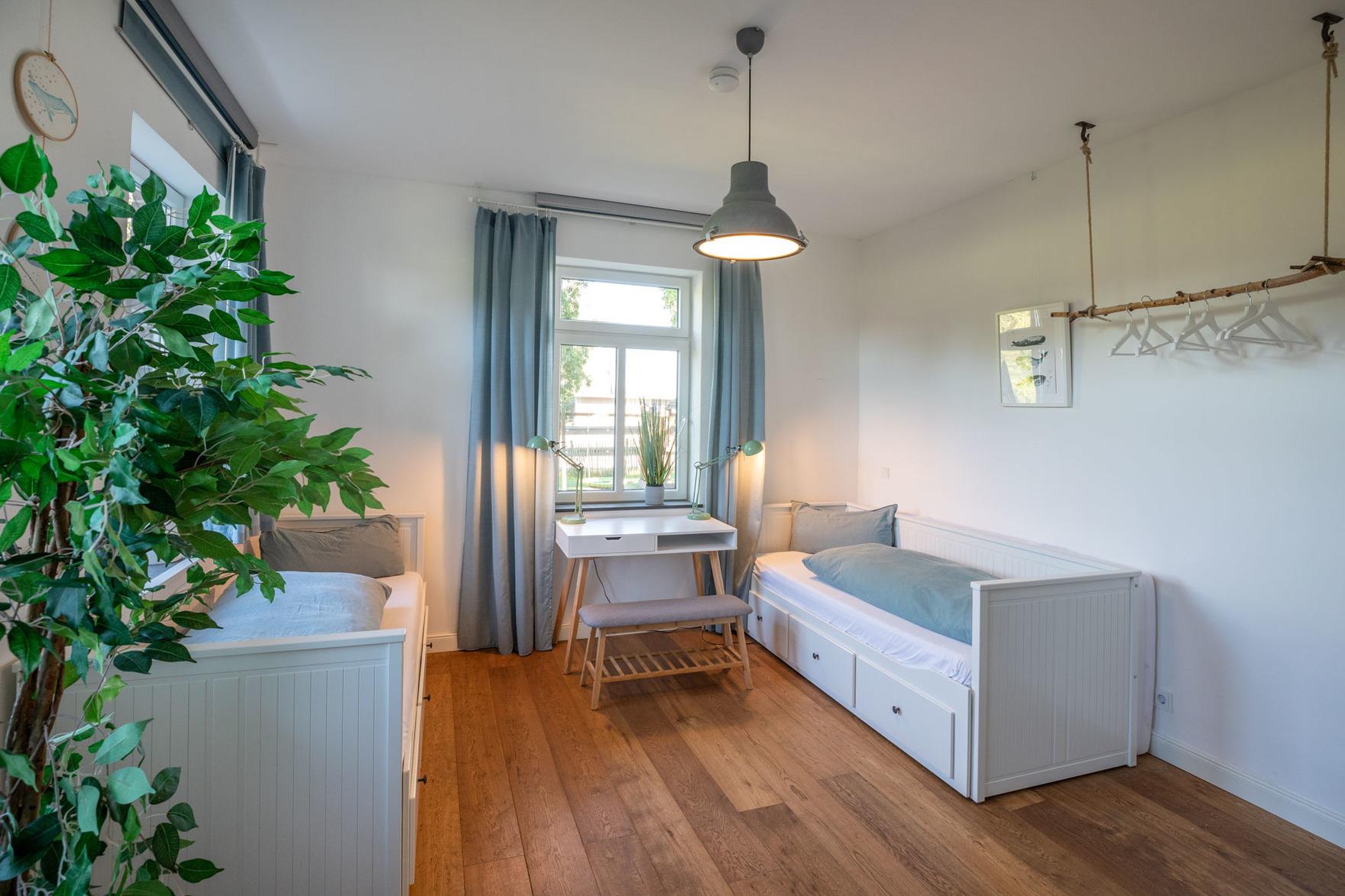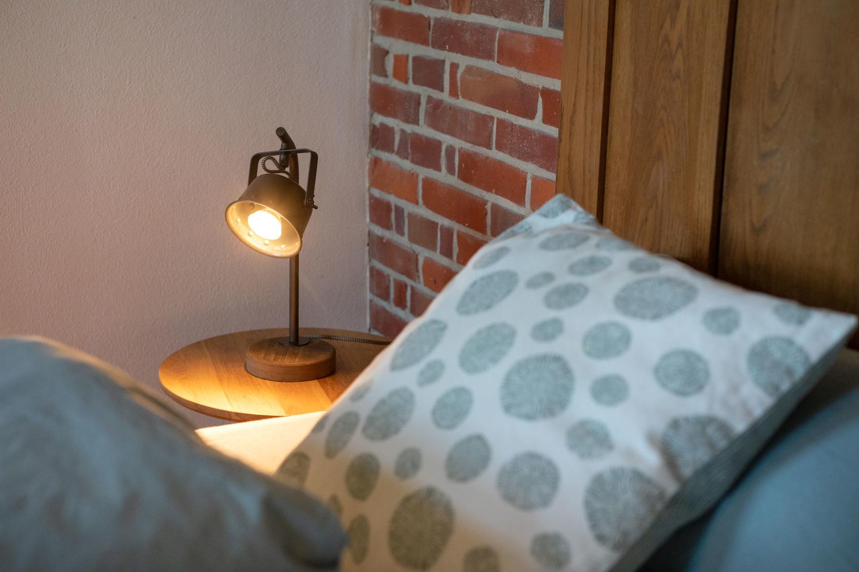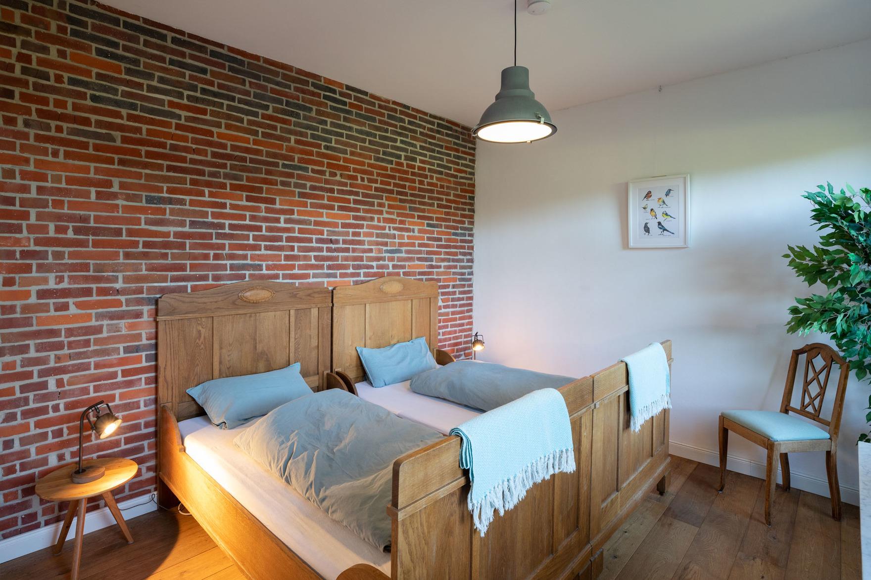 In vier Schlafräumen, davon ein Durchgangszimmer, bieten wir Euch acht Betten (3 Doppel- und 2 Einzelbetten), die zum Einkuscheln und Durchschlafen einladen. Ein Kinderbett kann zusätzlich auf Wunsch gestellt werden. So könnt Ihr mit insgesamt 8 Personen und Kleinkind Urlaub bei uns machen. Noch ein Freund mehr, der unbedingt mit muss? Das Sofa im Wohnraum (120 x 200 cm) ist zum Schlafen geeignet, sagt einfach Bescheid!