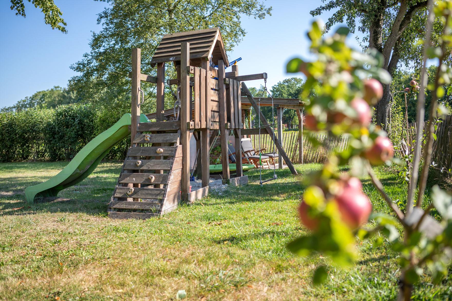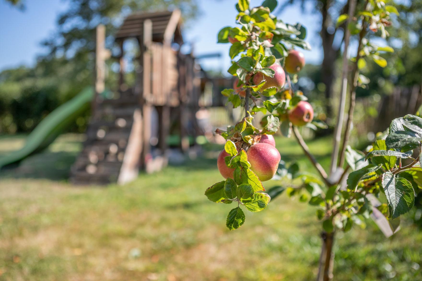 Vom 37 qm großen, hellen Koch-Ess-Wohnraum mit moderner, komplett ausgestatteter Küche und Essplatz für 10 Personen gelangt Ihr auf die Terrasse und in den eingezäunten Garten, in dem Ihr Eure Kinder und Vierbeiner frei spielen und laufen lassen könnt. Ein Spielgerüst sorgt bei den Kleinen für Abwechslung und ermöglicht Euch vielleicht die ein oder andere entspannte Tasse Kaffee oder Tee.
