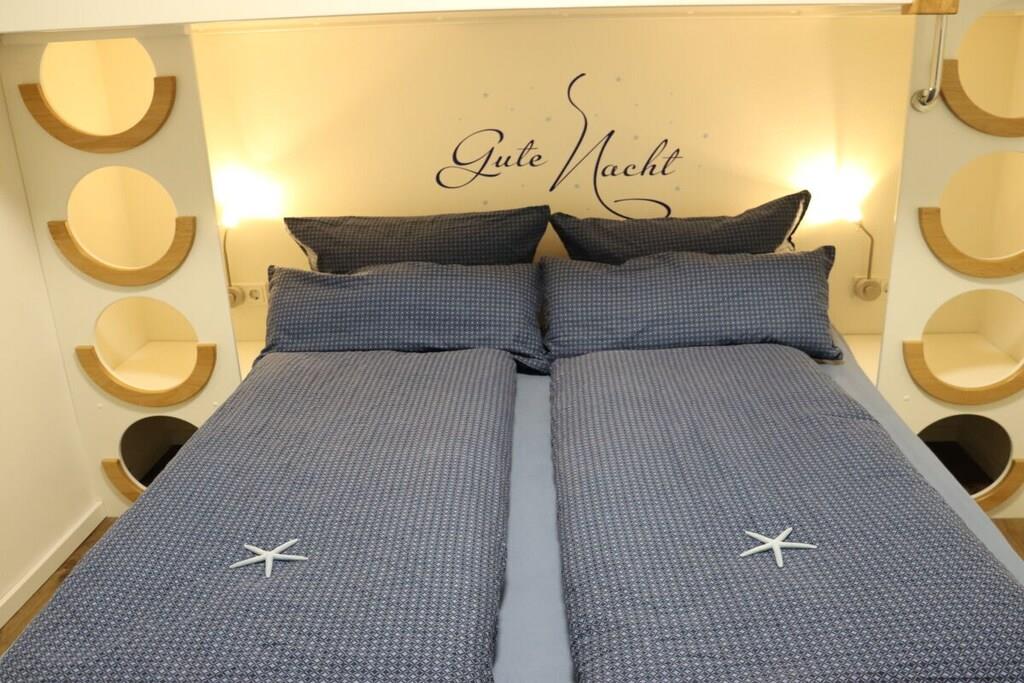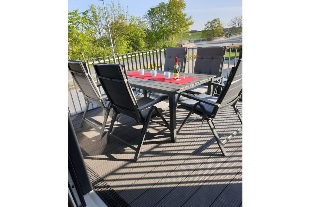 Unsere Ferienwohnung Ankerplatz bietet eine hochwertige Ausstattung mit vielen kleinen Details . Die 68m² große Wohnung befindet sich im 1. OG und bietet Platz für 5 Personen plus Kleinkind. Dort finden Sie 2 Schlafzimmer, 1 Bad mit eigener Sauna und Whirlpool , ein großzügiger Wohn - Essbereich mit offener Küche und Gaskamin. Vom Wohnbereich aus erreichen Sie den großen Balkon. Ein Parkplatz befindet sich direkt am Haus, sowie ein Spielplatz.