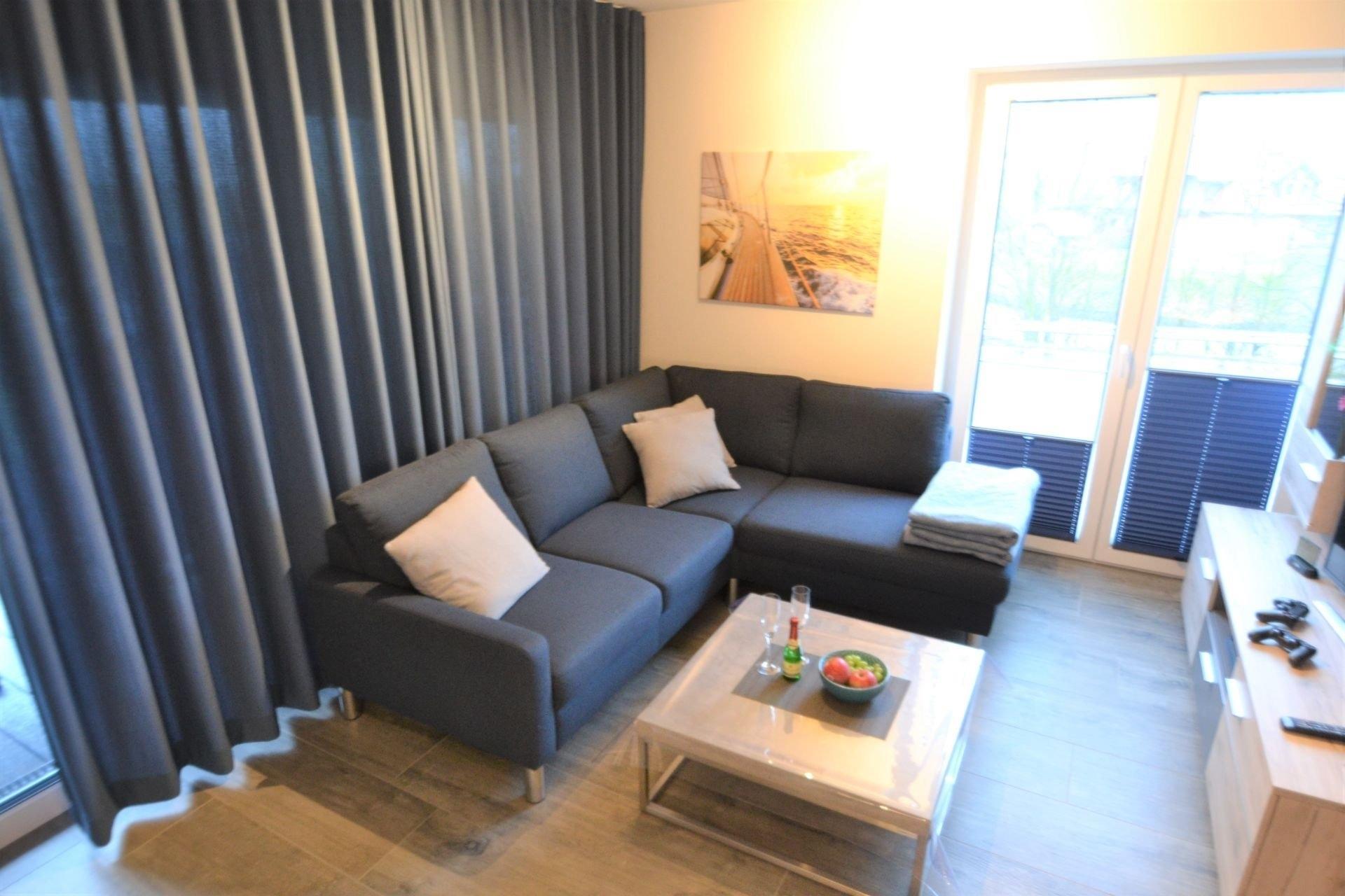 Die Ferienwohnung ist liebevoll mit Holzmöbeln eingerichtet und bietet eine gemütliche und wohnliche Atmosphäre. Genießen Sie den Ausblick auf die grüne Landschaft und das Wasser, entdecken Sie das Hafengebiet oder entspannen Sie einfach in der Wohnung.