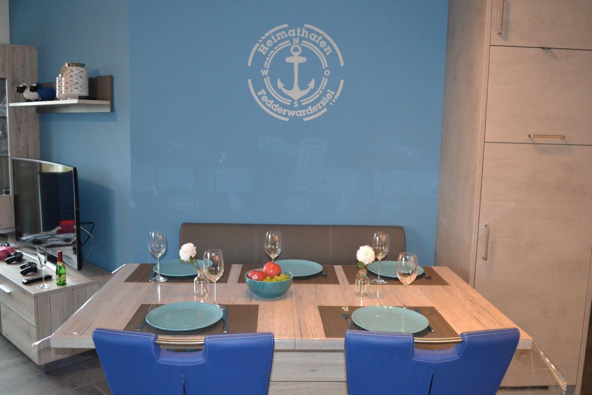 Gemütliche Ferienwohnung HeimatHafen in Fedderwardersiel mit Sauna, Whirlpool und Balkon für erholsame Nordseeferien.