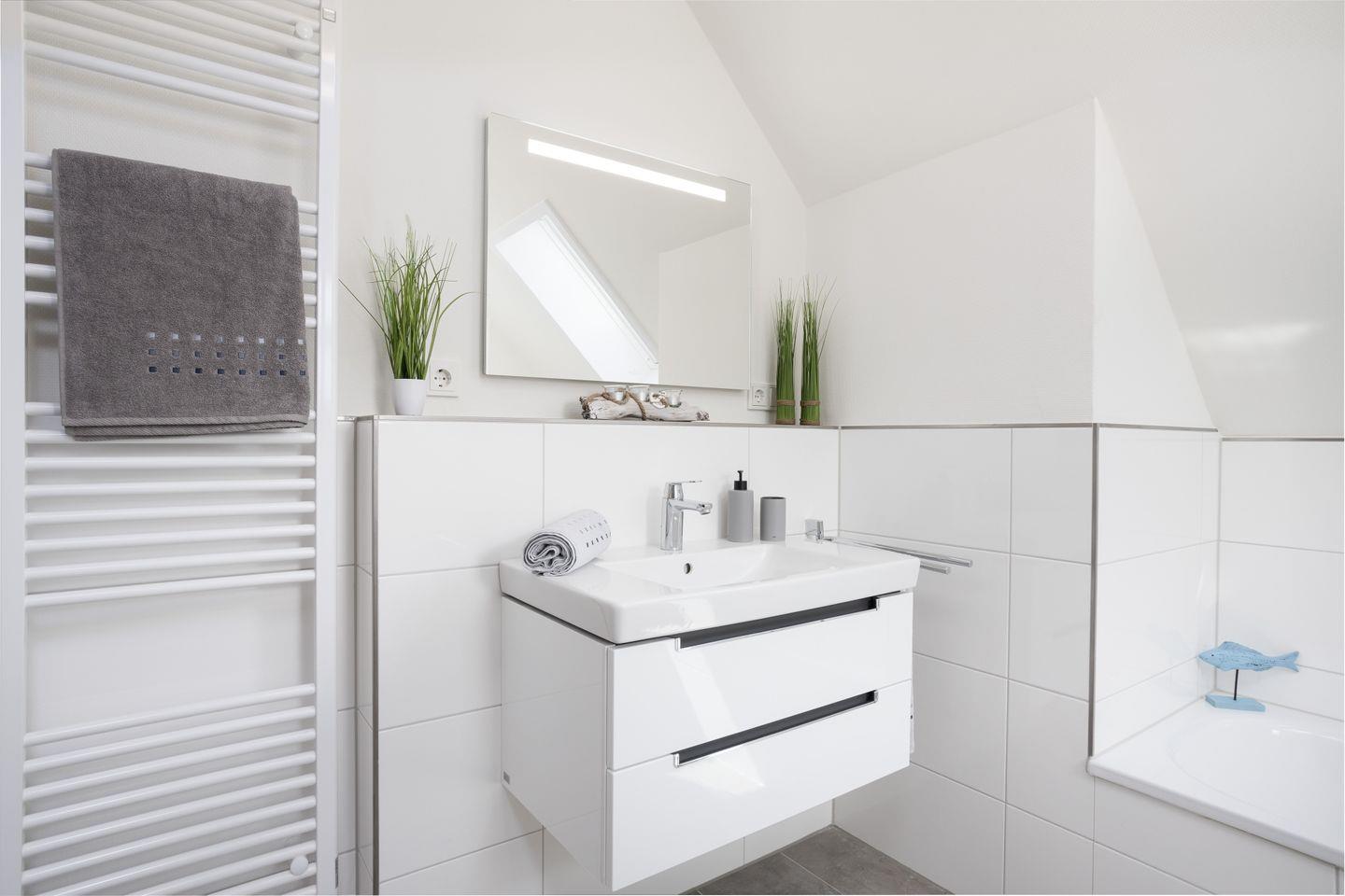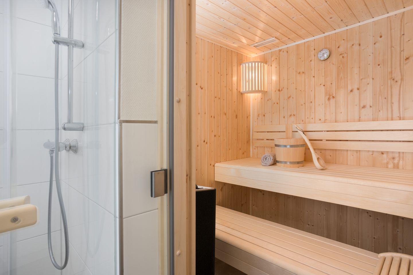 Im Obergeschoss findest du das moderne Wellnessbad mit Sauna, Dusche und Badewanne – perfekt für deine persönliche Auszeit. Ein zusätzliches Duschbad im Erdgeschoss sorgt für extra Komfort, besonders bei voller Belegung.