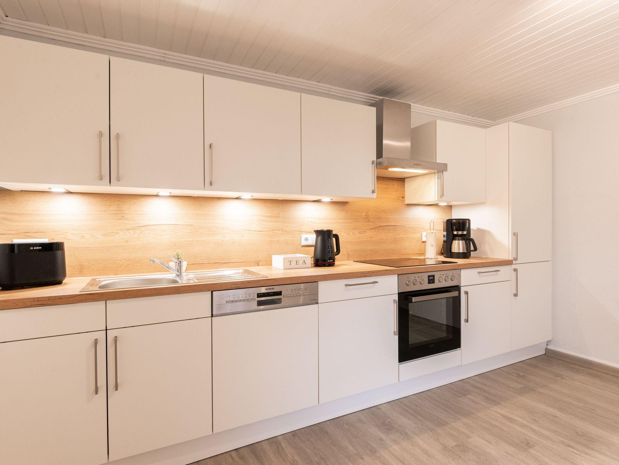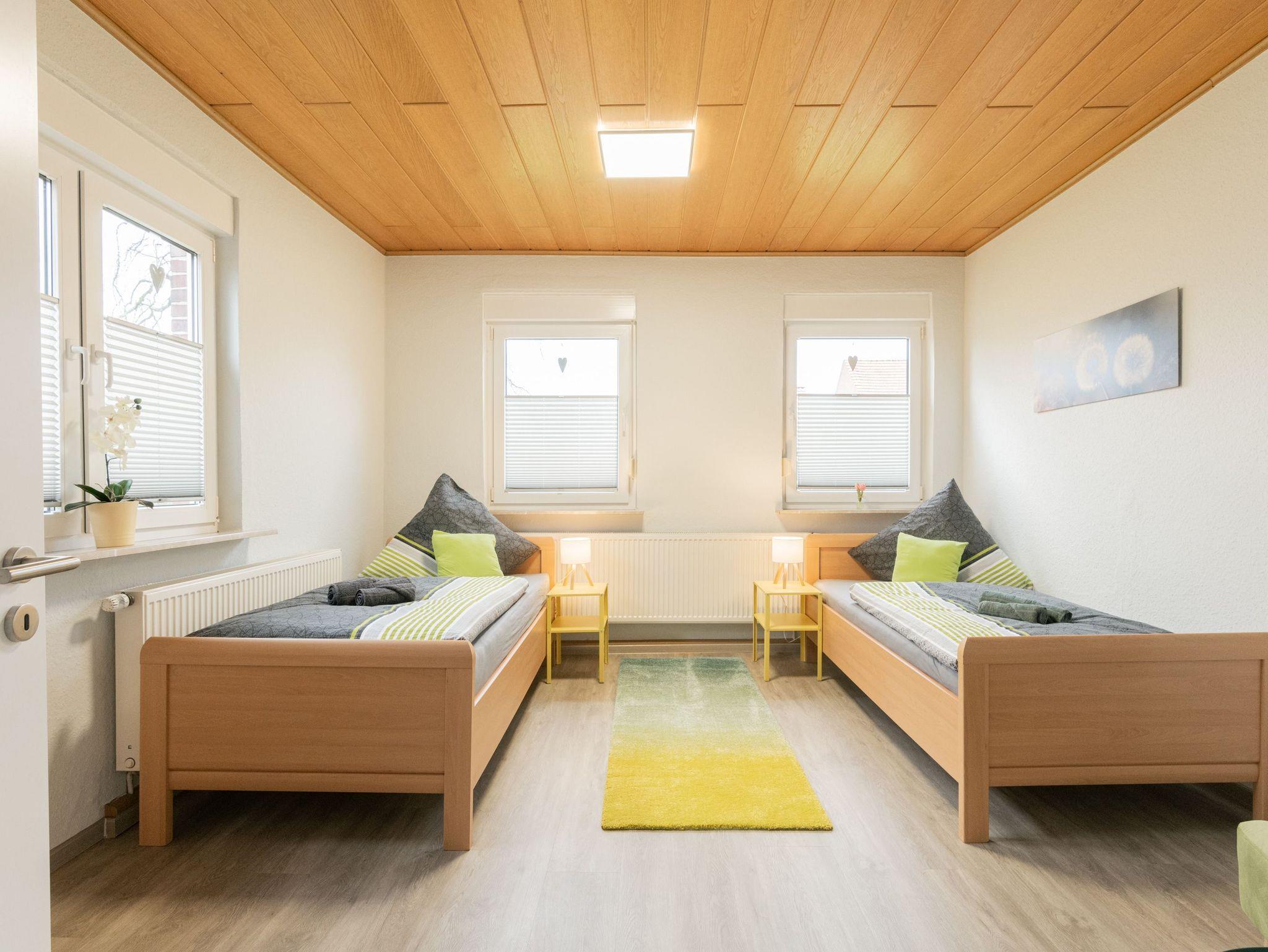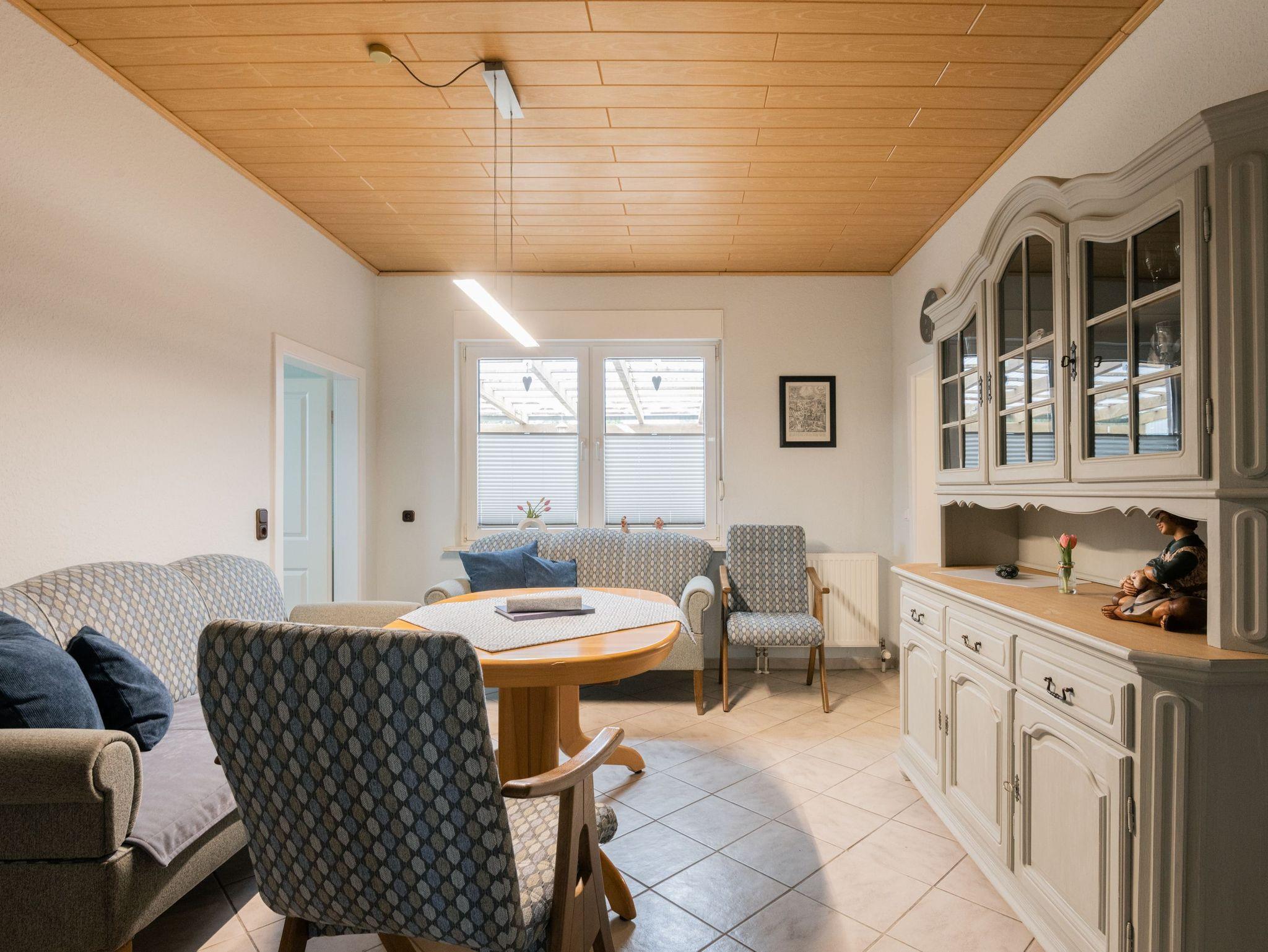 In der Ferienwohnung befinden sich zwei Schlafzimmer (1 x Doppelbett 180x200cm und drei seniorengerechte Einzelbetten 100x200cm), eine voll ausgestattete Küche incl. E-Herd, Spülmaschine, Kühlschrank, Kaffeemaschine etc.