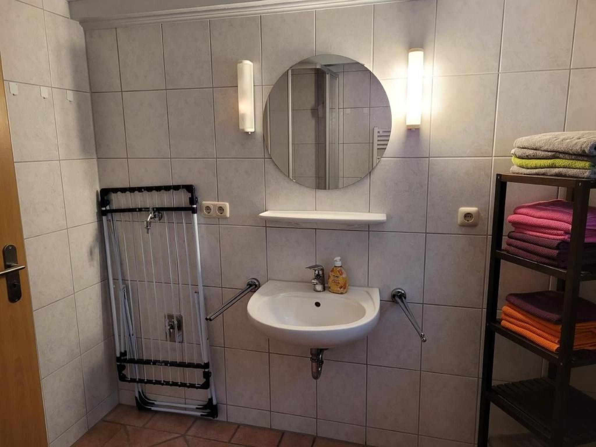 Badezimmer mit Dusche und WC, Separates WC, Kinderhochstuhl und Kinderbett sowie Wickeltisch.