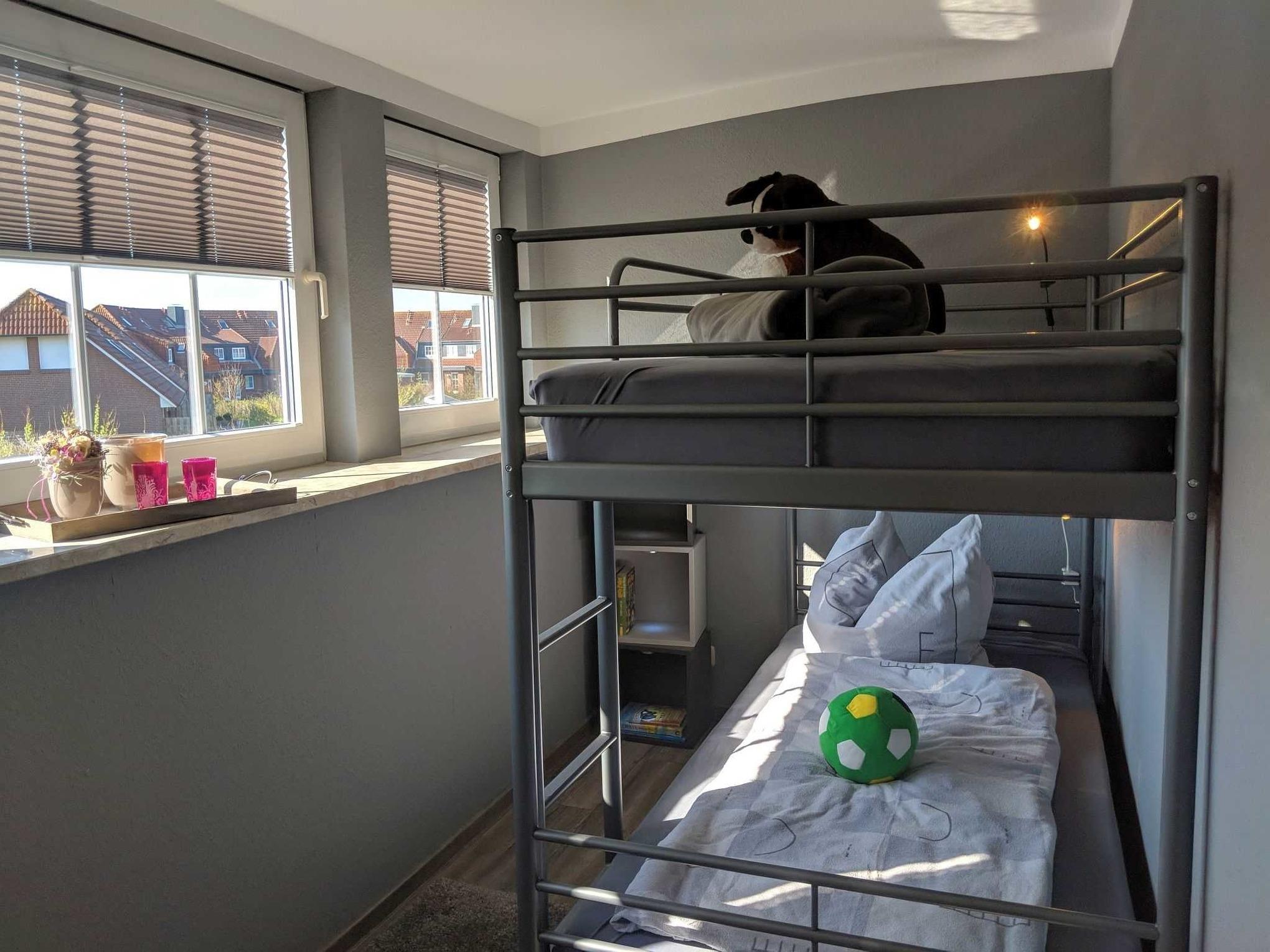 Das Ferienhaus bietet bis zu 6 Personen in drei Schlafzimmern Platz. Zwei Schlafzimmer sind mit hochwertigen Doppelbetten ausgestattet. Im dritten Schlafzimmer befindet sich ein Etagenbett in den Maßen 90x200cm. Ein Kinderreisebett sowie ein Hochstuhl steht für die kleinsten Gäste kostenfrei zur Verfügung. Im kernsanierten Badezimmer erwartet Sie eine geräumige Dusche und genügend Ablagemöglichkeiten für Ihre Kosmetikartikel. Ein weiteres WC im Erdgeschoss sowie die bereitgestellte Wachmaschine und ein Wäschetrockner runden Ihren Urlaubskomfort ab. Im gesamten Haus befinden sich elektrische Außenrolladen an den Fenstern.