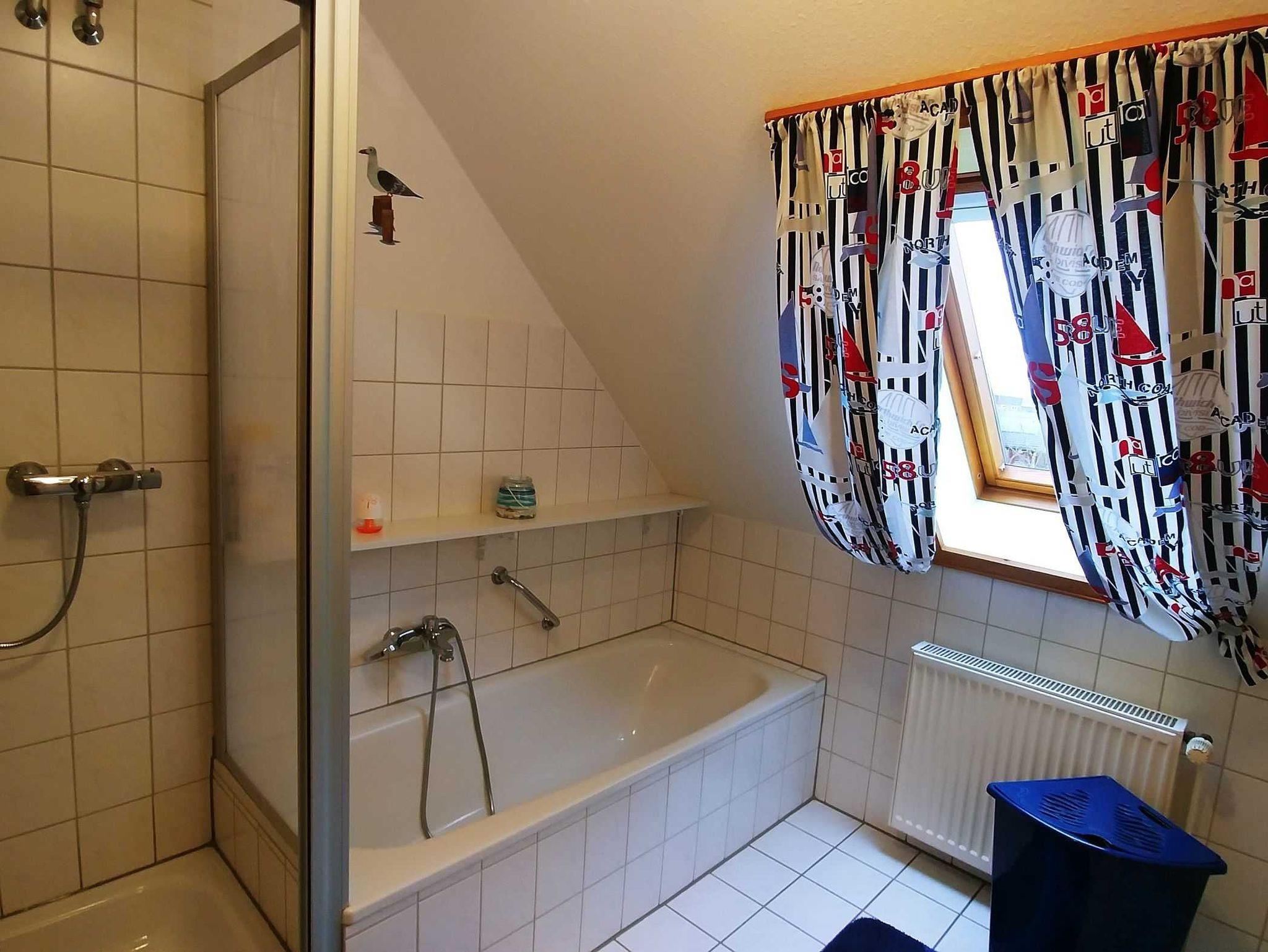 • ein Badezimmer mit WC, Duschkabine und Badewanne.