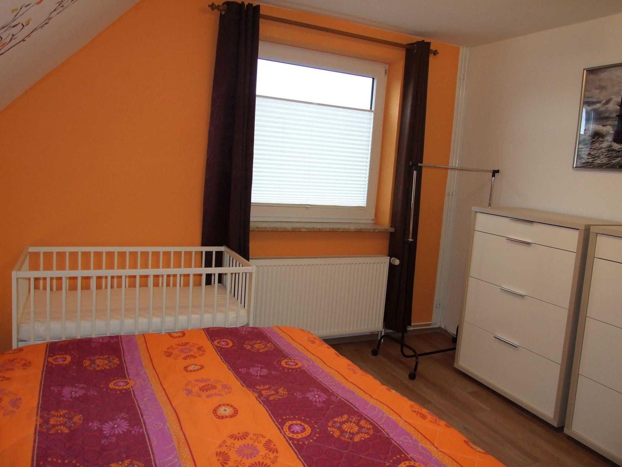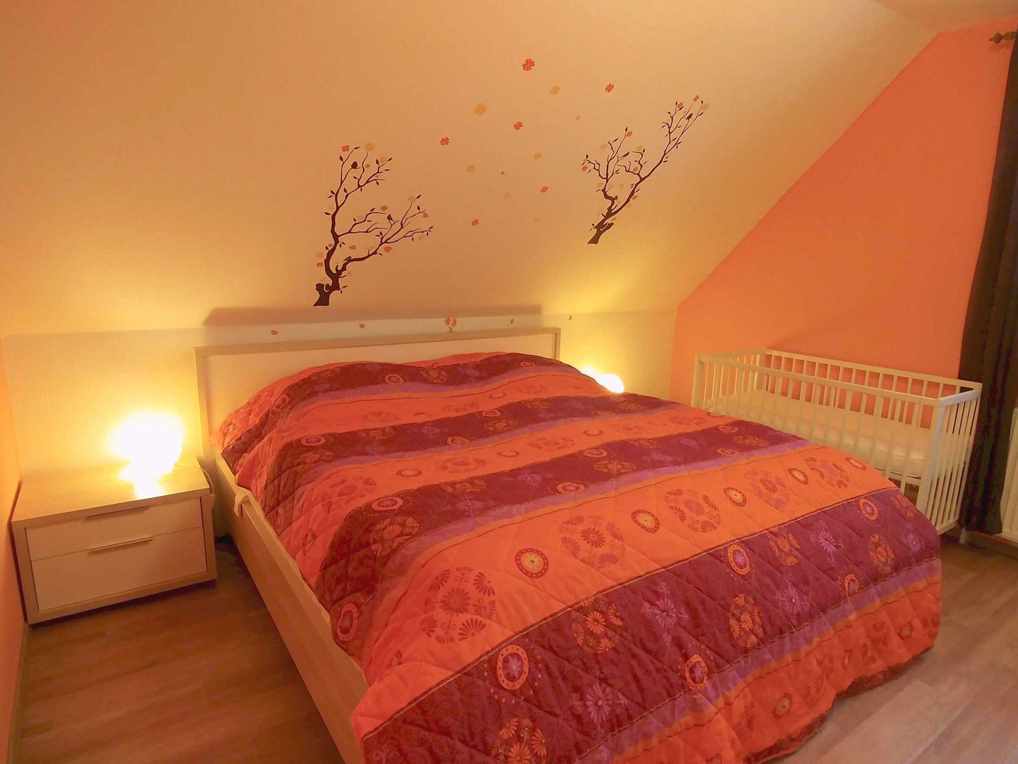 • ein großes helles Schlafzimmer mit Doppelbett 1,80 x 2,00 m, sowie ein Kinderbett, ca. 0,60 x 1,20 m
