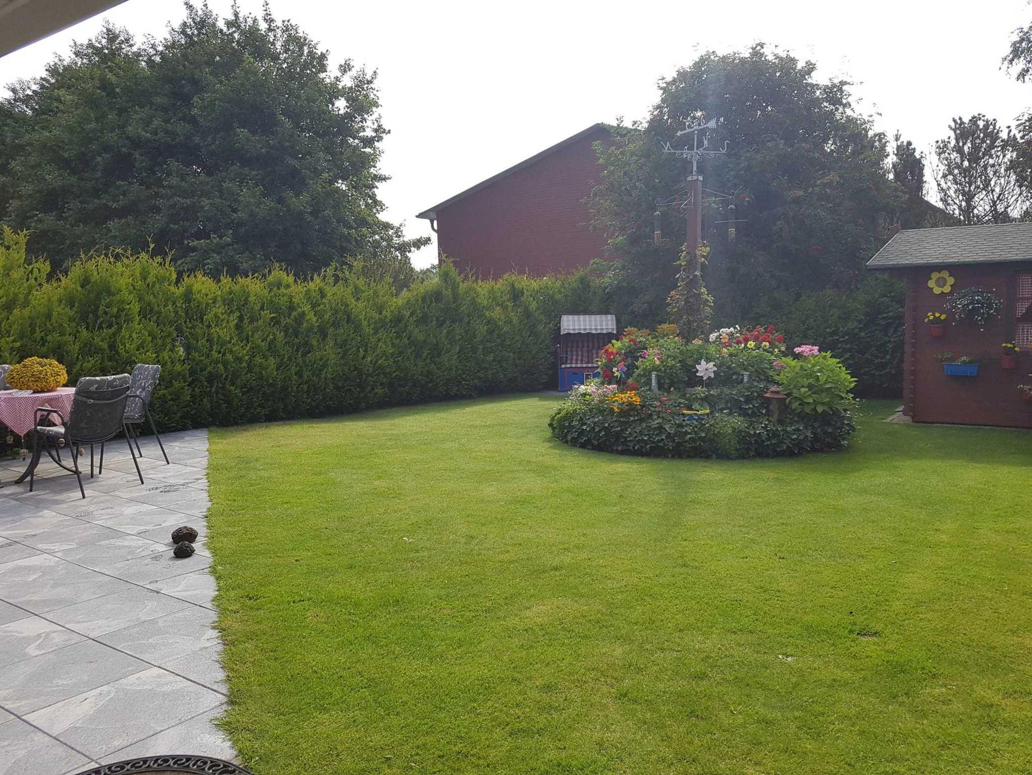 Der große Garten ist komplett mit einer Sichtschutzhecke bepflanzt und bietet Platz zum Toben. Zum Entspannen lädt ein Strandkorb ein. Die Terrasse ist überdacht und windgeschützt. Gartenmöbel, Auflagen und ein Kugelgrill stehen zur Verfügung.
