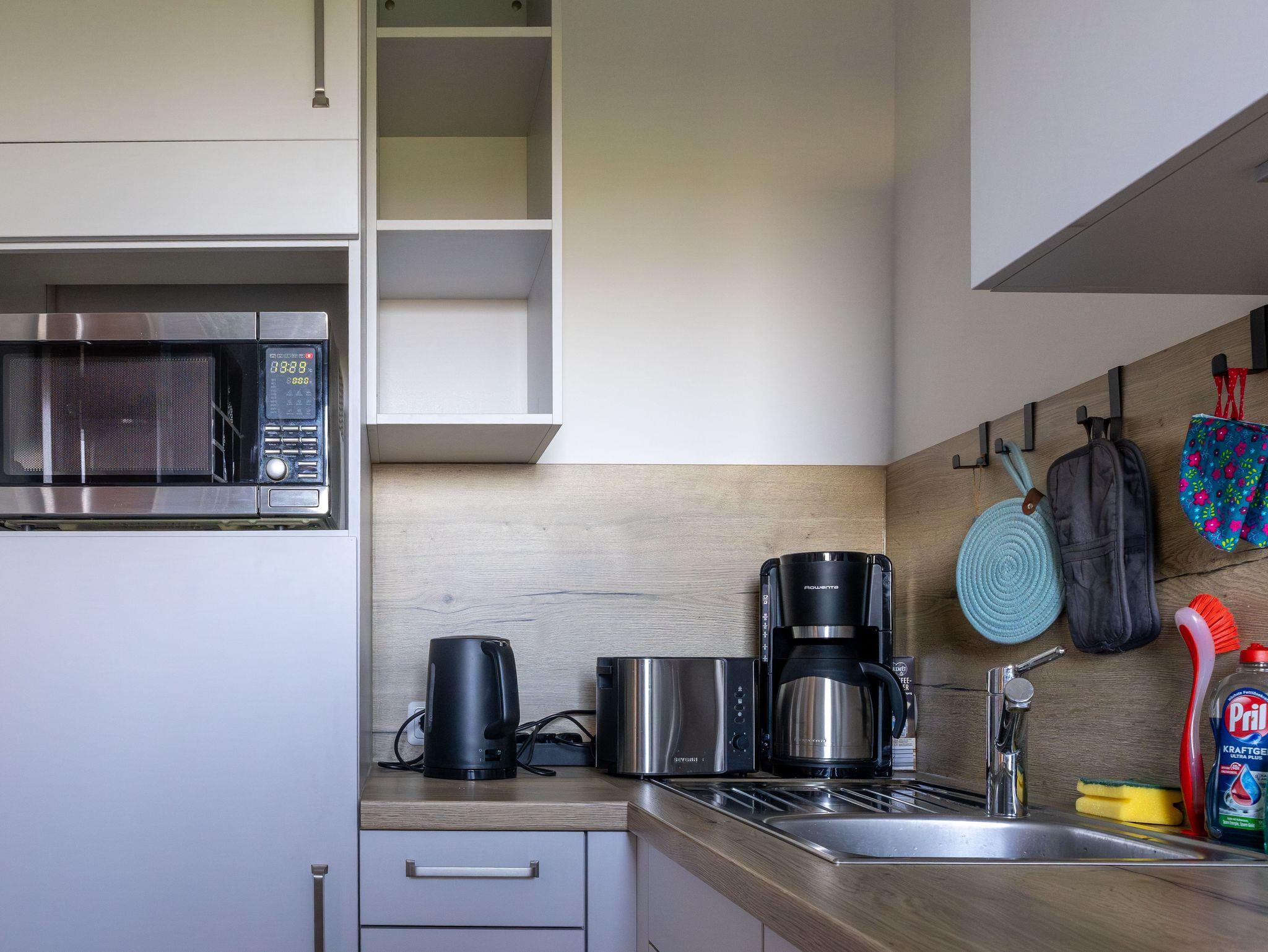 Sie befindet sich im EG eines Mehrfamilienhauses und hat eine voll ausgestattete Küche, einen großen Wohn- und Essbereich, ein Duschbad sowie ein separates Schlafzimmer.