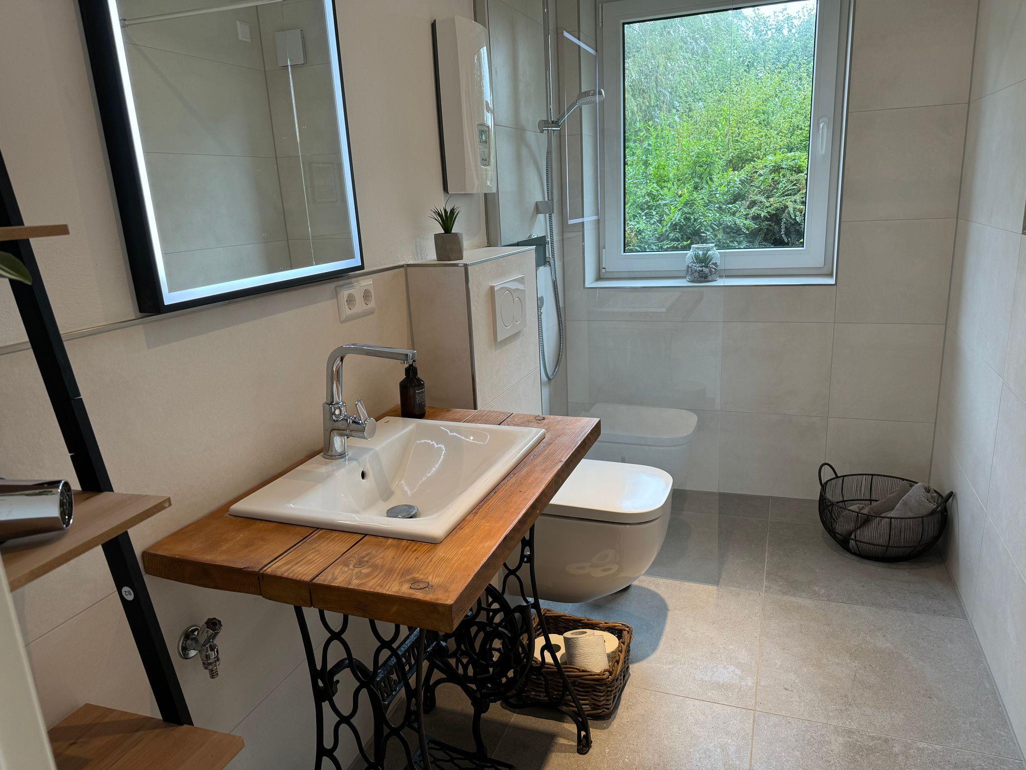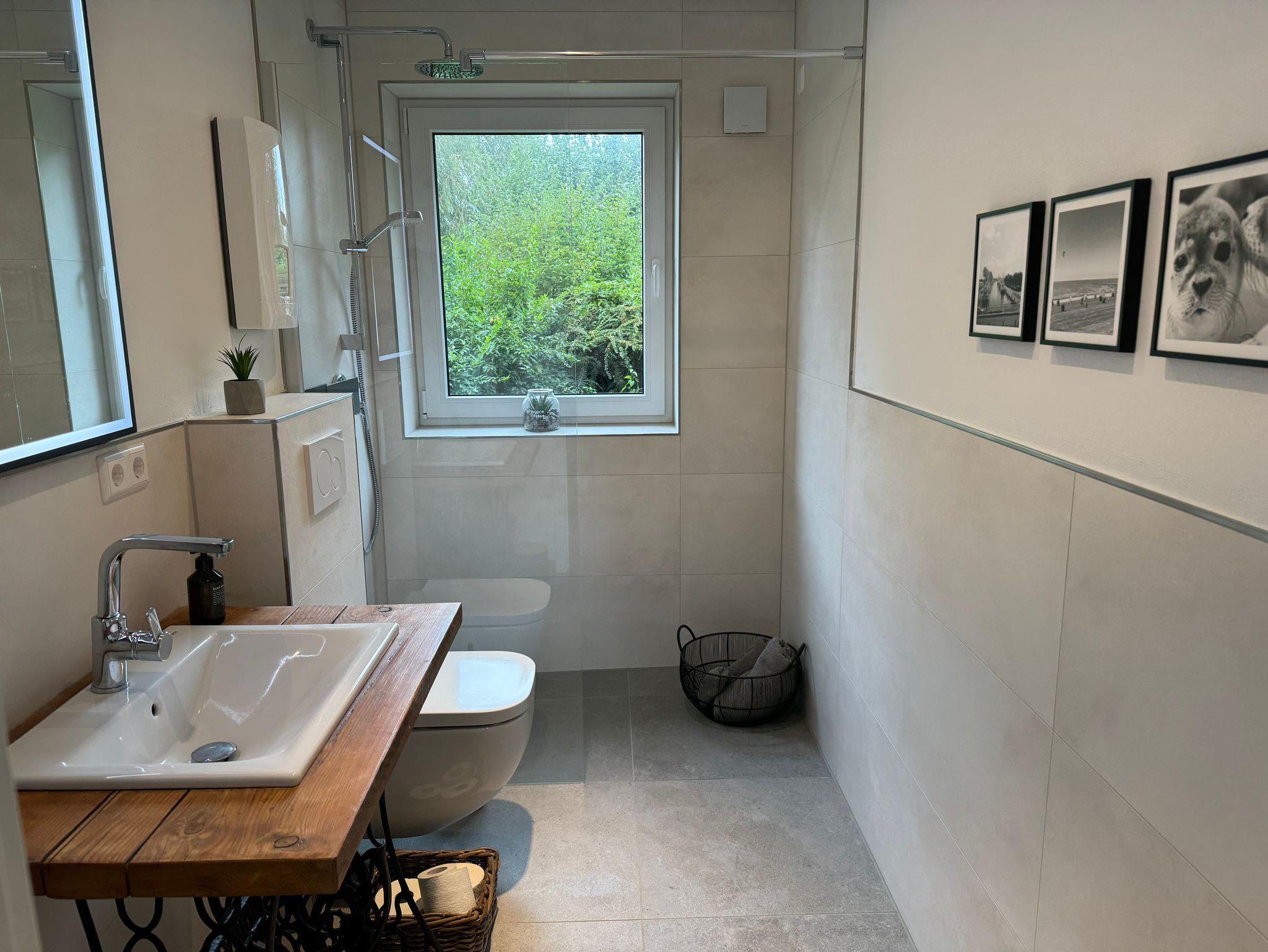 Das ebenerdige Badezimmer ist eine wahre Wohlfühloase. Mit einer ebenerdigen, komfortablen Regendusche, einem beleuchteten Spiegel, Kosmetikspiegel und Föhn und Abstellflächen.